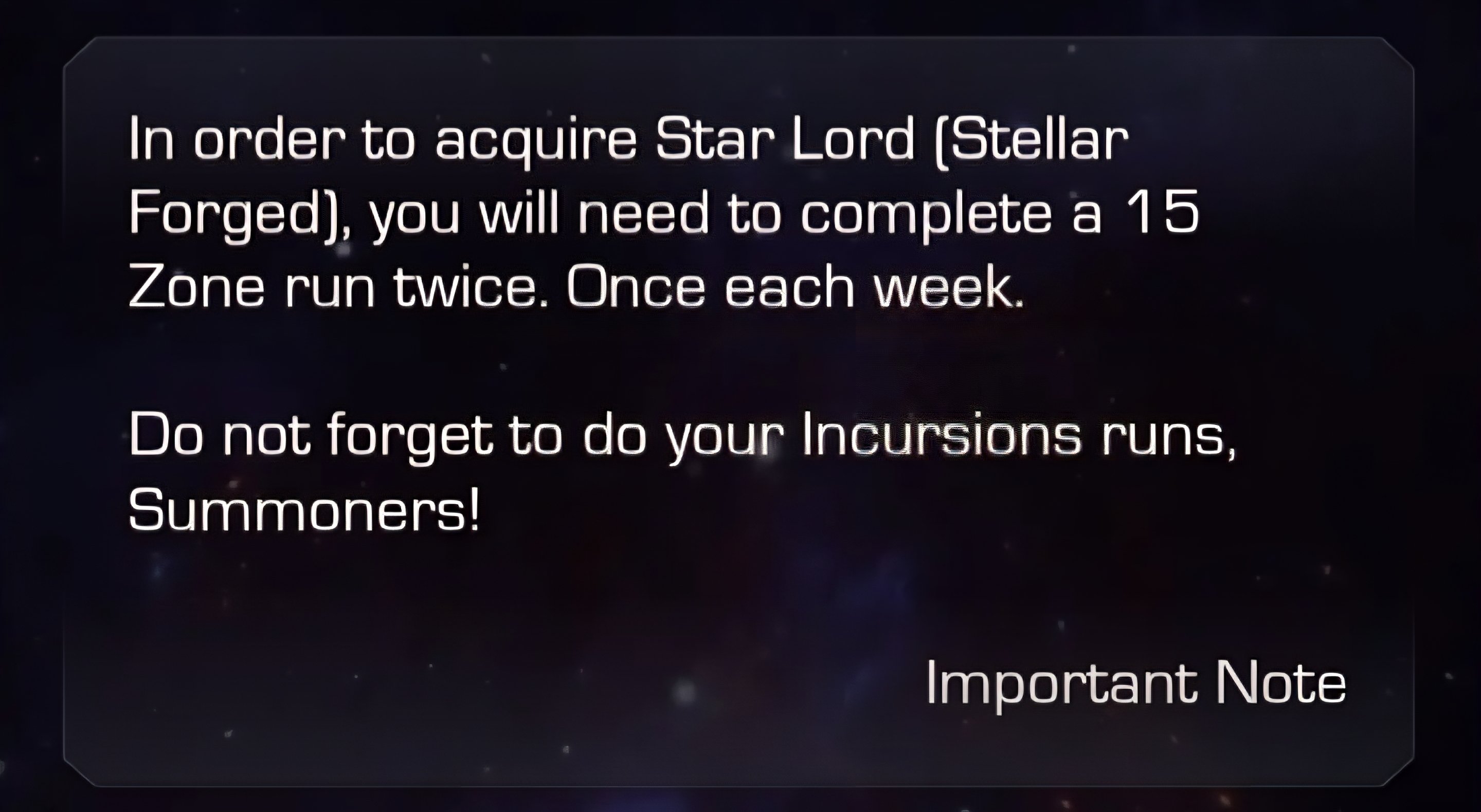 Doing incursions twice isn’t too bad - but I don’t understand why they couldn’t have given us the piece for completing either week so we could use Star Lord against this week’s coliseum Void. It would have been a fantastic opportunity to let us really get a feel for SF SL in content he’s built for, against a science champ, let them get more attention and interest in SF champs… disappointing choice