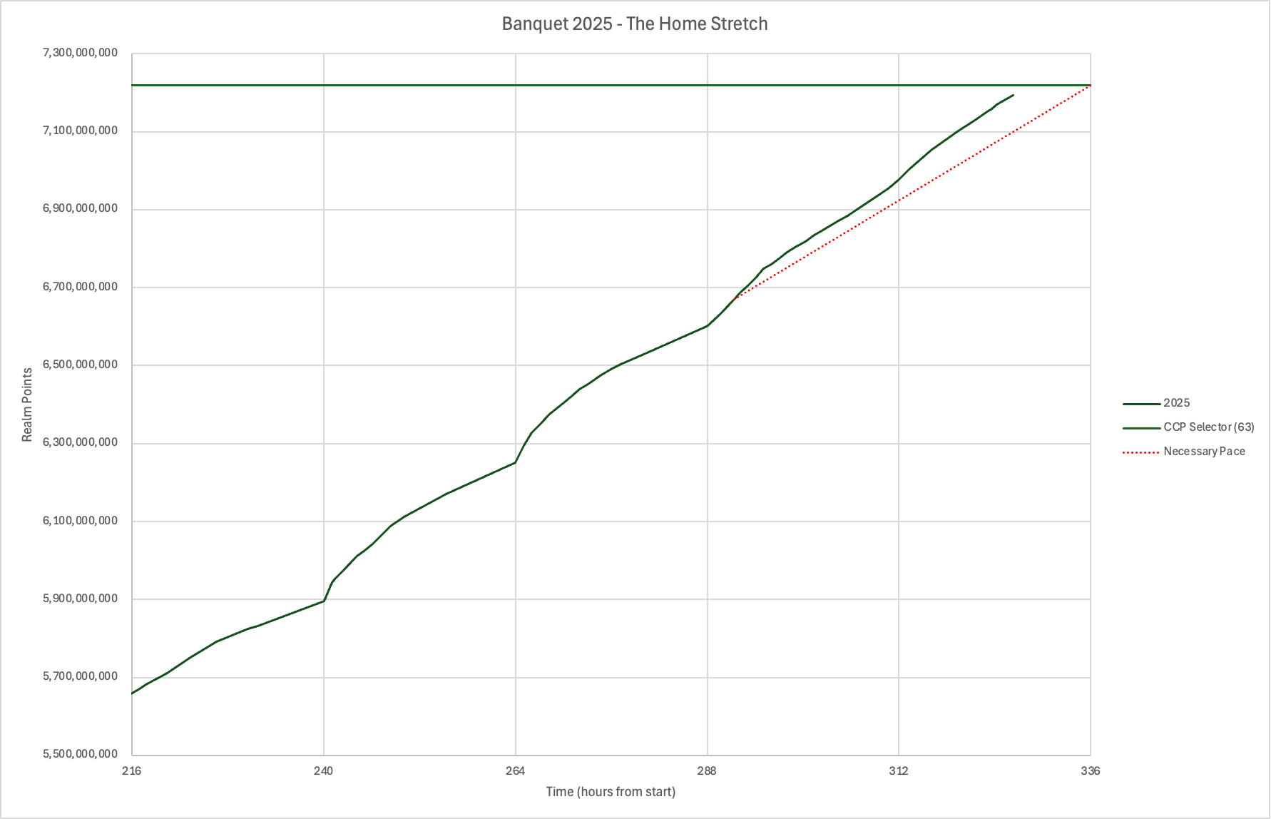 The required rate to reach milestone 63 has plummeted to about 2.7 million per hour, which sounds like a lot but that's lower than at any time during this banquet or last year's banquet. As I write this (the charts are a bit behind as I created them a little while ago) we just crossed 7.2 billion. 20 million to go. At the current slightly slower rate I'm seeing milestone 63 should now be reached sometime around 2:30am Pacific, a couple hours later than originally projected.