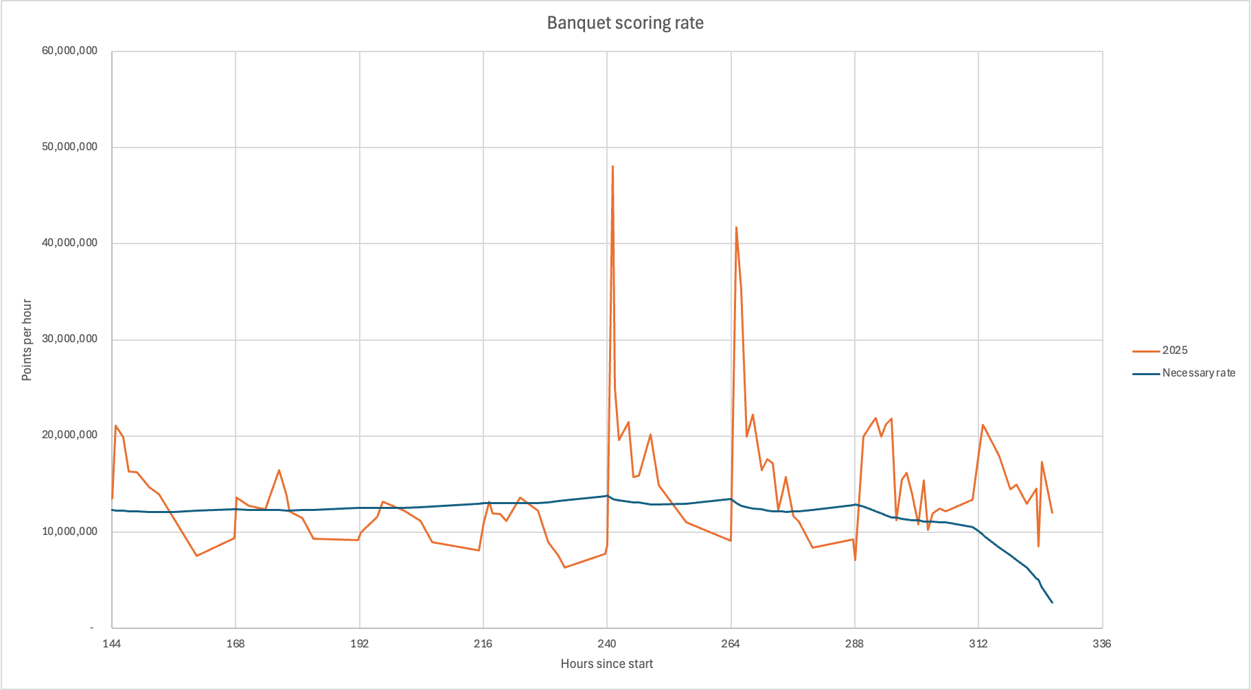 Here's where we are now. You might notice there was a big glitch in our speed: we dropped to 8.5 million points per hour, then jumped up to 17 million points per hour. What happened in the game to cause that to happen?