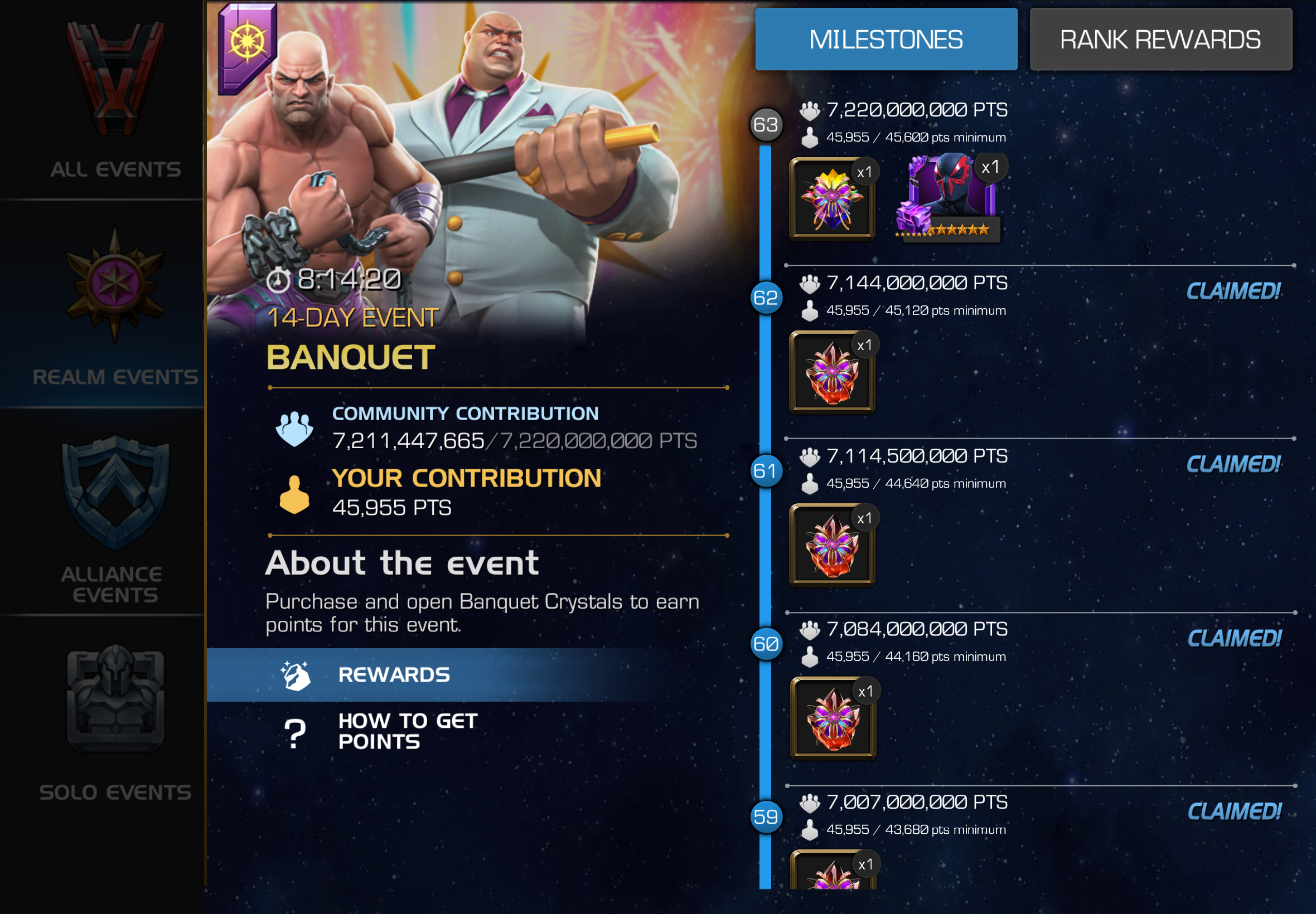 Okay, fine. You all can stop snoring now. At the moment we're about 45 million points away from milestone 63. At our current actual average scoring rate that's about 4 hours out. If and when we reach it, Kabam will unveil another milestone. I'm sure they will be thinking about what will anger the player base the most, and sticking that in there. It might be a PHC, it might be a first appearance 5* Groot, it might be 50k solo shards. The possibilities are endless.