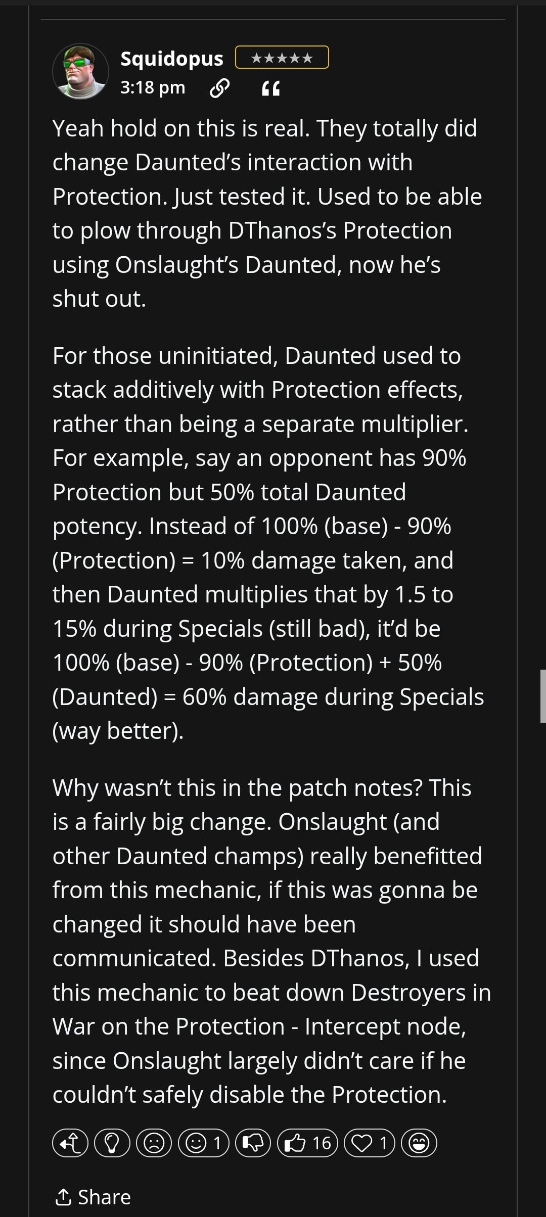 I came back from the post and it's absolutely atrocious to how they phrased it. "First of all, we're gonna fix an accident WE created in the first place so you should thank us but now get ready to get screwed over for absolutely no reason at all!" They literally gave us a small sneak peek to Hulkling's as-supposed damage and then proceeded to progress with something game-changing for an entire class without any sort of prefacing, not even so much as a side note. It is definitely a silent nerf no matter how anyone puts it, "that's how the game is supposed to work" isn't the excuse when it's been discovered and shown to function as such throughout the years.