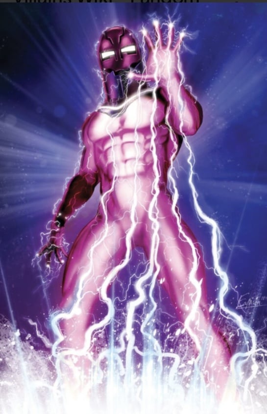 A spotlight shines on Wonder Man, and he begins striding towards the opponent. He casually blocks a desperate punch by the opponent with a glowing ionic energy force field. He then unleashes a series of impossibly fast ionic energy strikes, before finishing by striking a heroic pose