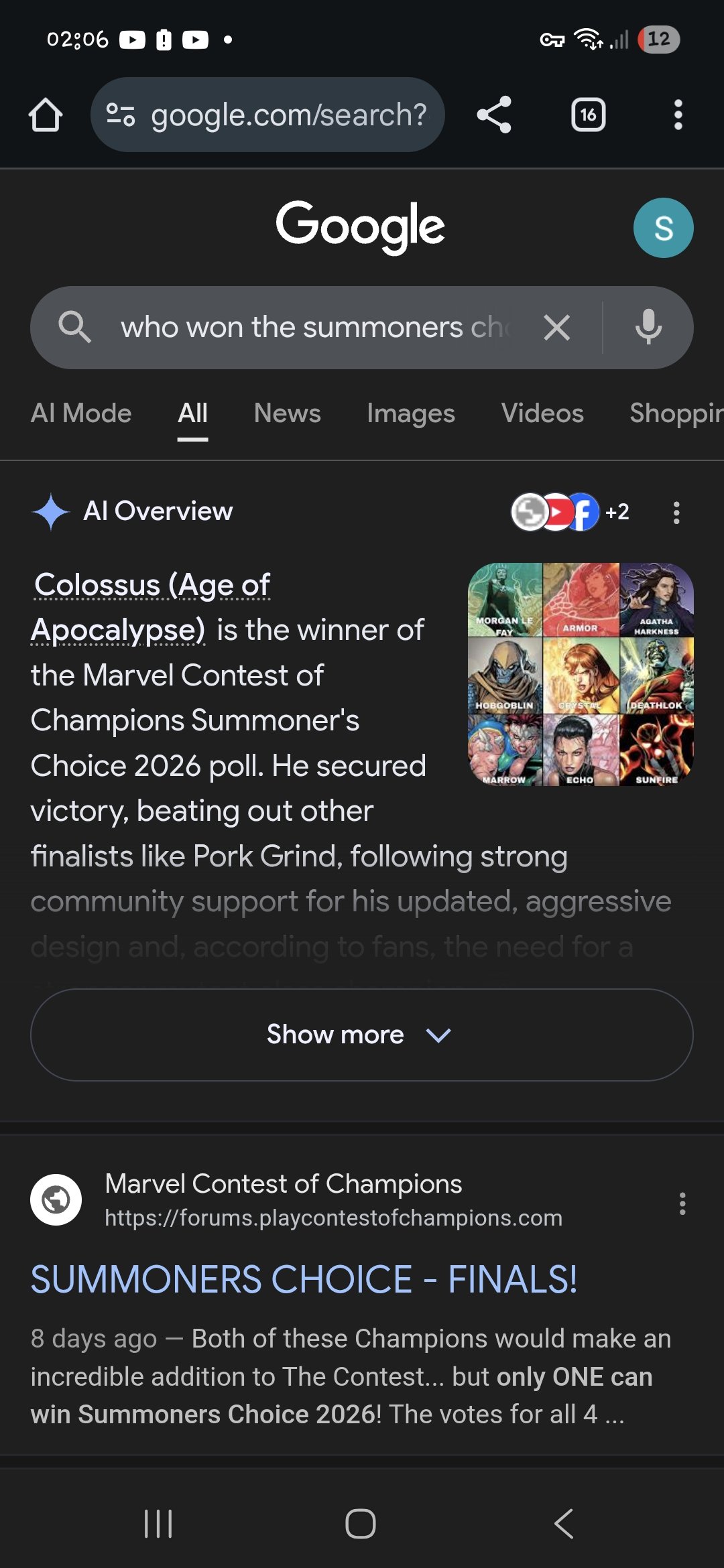 Re: Google ai is saying that colossus won the summoners choice 2026
