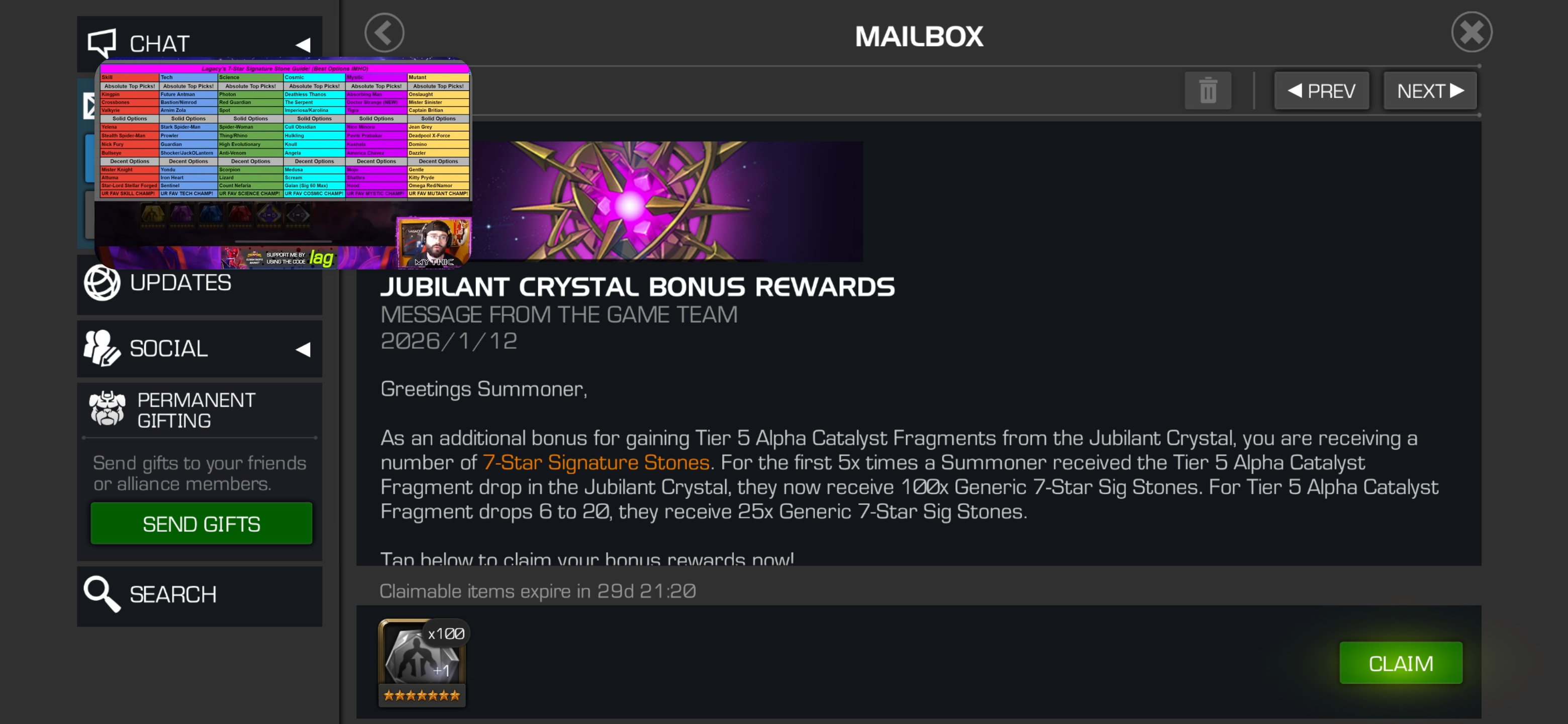 the original email that came through was showing 200 sigs. Given the discrepancy I enquired with some alliance members who had suggested I check stash as their additional sigs were showing up in stash. Without collecting from email, I checked stash where I saw 100 sigs which in aggregate made sense totalling 300. Went back to email only for email to revert to 100. Collected the 100 before going back to stash only for there to be no further stones in stash. In short , received 100 in total vs expected 300. I had very clearly noted pulling t5 alpha cats on three separate occasions as was keeping track of my pulls from the Jub crystals .