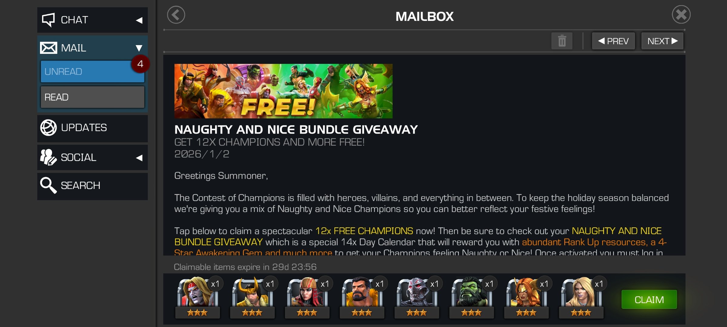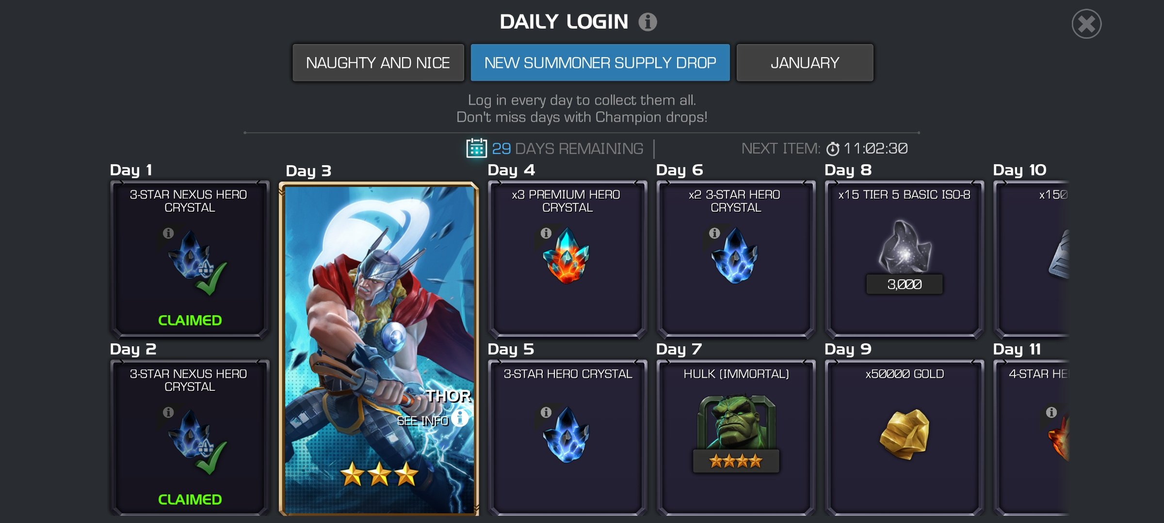 Account day 1 update. I did manage to get some stuff from Christmas and got a whole bunch of free naughty and nice 3*s. I also did the January side quest and got a bunch of free 2*s. I maxed out 3* Ultron to clear content for now. Looking ahead at the calendars, I'll be getting my first 4* sooner then expected since I got a naughty or nice selector in a few days. I think I'll be getting 4* Angela for the utilities she has to help with some bosses in act 6. I'll also be getting ihulk in a bit from the new account calendar.