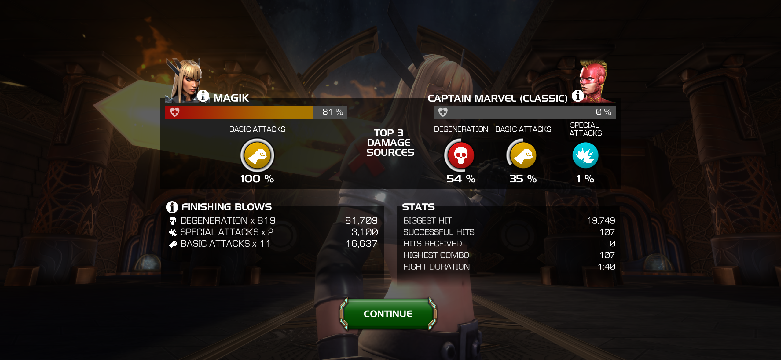No boosts, no synergies, no relic, no MD. I entered the fight, went straight to the sp3 and launched it. Decelerated the limbo while it was paused. Waited for the limbo to expire right before I got my second bar and launched my sp2, and then decelerated soon after (you might let it run just a tiny bit depending on how much power you have left after the special). I kept cycling sp2s waiting for limbo to expire right before my second bar and throwing the special, and eventually killed her getting up to and maintaining 24 degens once I used my second sp2. The hard part is maintaining the sp2 degens which can happen easily because of AI. Once you lose those you're back to the 4 base degens which sucks. So far this is the best I've done with Magik.