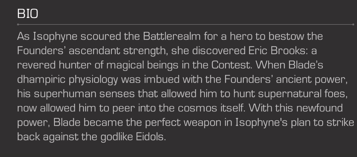 his bio also let’s us know important narrative info as Isophyne plans to use him as a weapon against the Eidols.