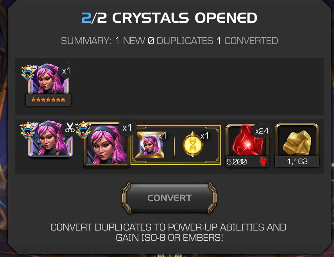 gonna save the 3 remaining empowered crystals to bring them up to 10… then do a batch opening again. i seem to have “better” luck gatting 7* and 7*-ascended champs when doing the batch open rather than spinning singly.😇