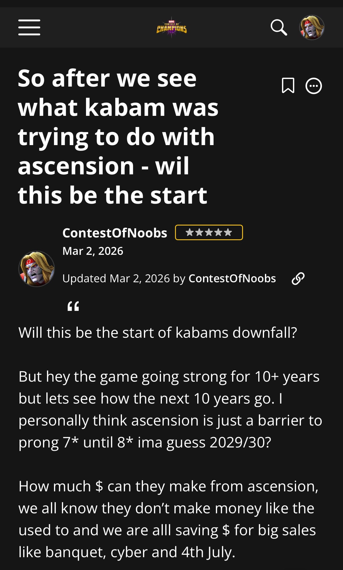 actions speak louder than words and kabams actions show that they don’t care . What other conclusion can we come up with after totally limiting how and when we can use currency that we’ve earned for years ? Why other conclusion can be made when stores were thanos-snapped into non existence without telling us they’d be removed ? What other conclusion can be made when allllll the information is finally release about ascension and it’s a huge mess?