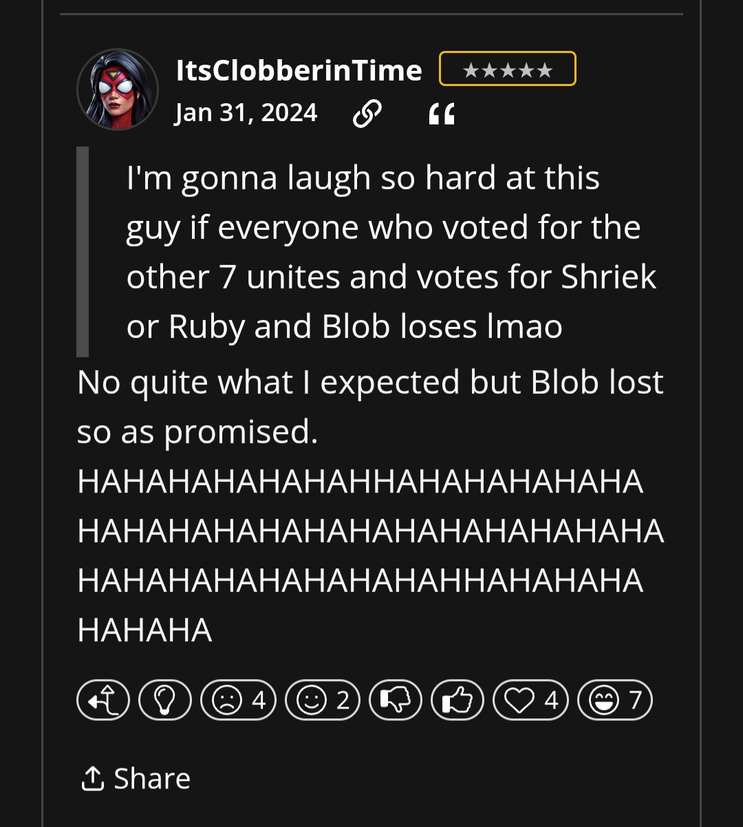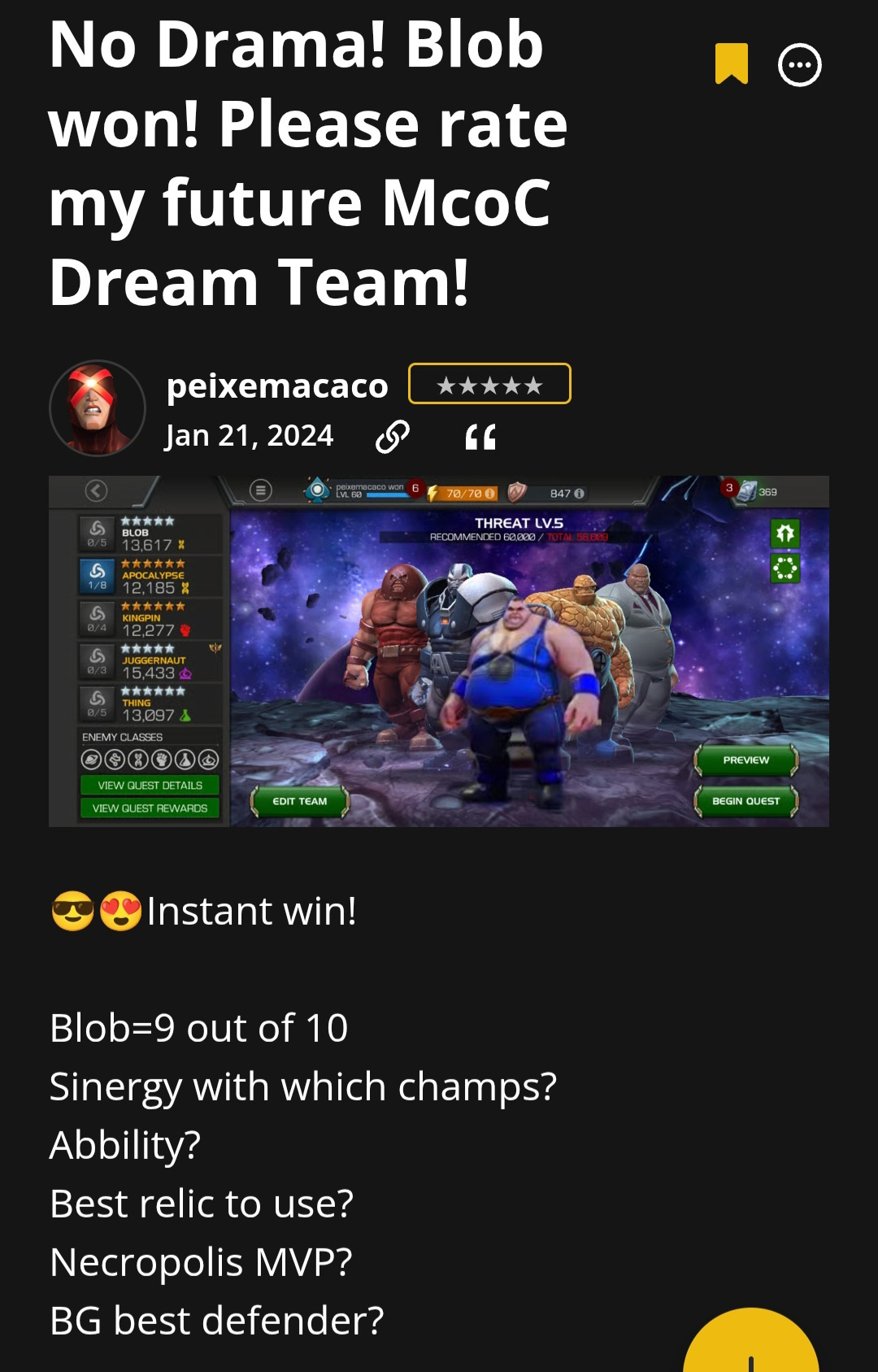 Honestly, think Luke Cage is better then this guy ngl the indestructible is on only non contract damage debuffs thats dumb af. Also doesn't look like he gains damage from putting debuffs on the opponent like Luke does. So his a really watered down luke cage. Also 2 immunities in the big 26 and one being power steal??? Like what is that? I cant fight techs that power burn me, only mystics that I already have a advantage against? Should have given him posion or incinerate immunity with bleed. The ramp looks so unbelievably long like by the time I get to the "good damage" the opponent is already one shot. Personally think kabam dropped the ball here. Like all he need to do is be a good damage dealer with solid immunities. Keep it simple maybe not he needs to do all these mid things to get little to no value out of it. Like I'm not ragebaiting Luke Cage a street level hero can affect ability accuracy by putting debuffs on the opponent by hitting them and doing a special 1 into 2 that does more damage and more ability accuracy reduction depending on how many debuffs there was on the opponent. That give significantly more value then red damage number that do not that much extra damage after like a min of fighting. I hope I'm wrong and BM is good but right now he looks pretty bad.