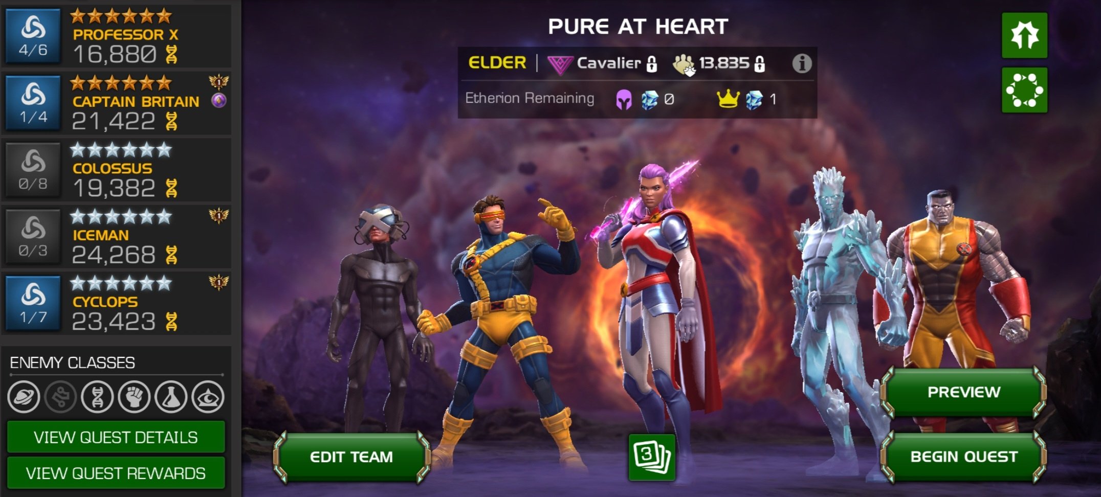 Elder mark, at first I didn't like it but then I ended up liking it cause I eneded up using the squad I love sening that are worth doing 15 brawls. The mutant chapter, I brought Professor X, Iceman, Cyclops, Captain Britain & Colossus. The synergy bonuses with Xavier makes the brawls so fun.
