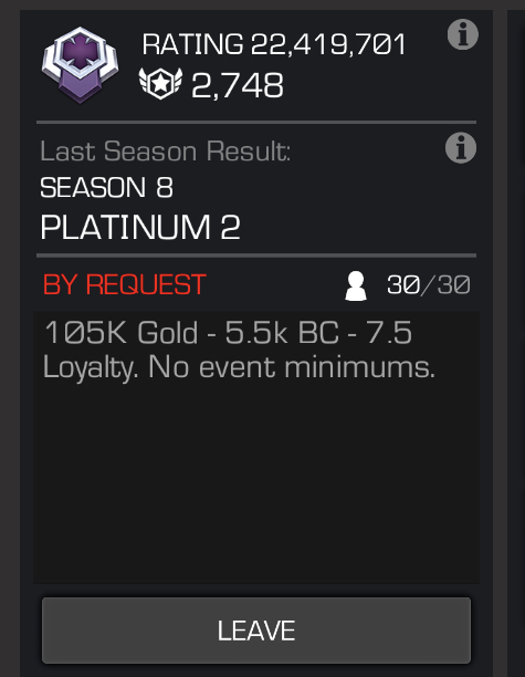 Minimum of 3 Rank 5s or better. We would love to hit Plat 1 next season. No event minimums. We play Map 5 during AW season (usually map 6 once), and Map 6 in the off-season. Message me on line or in game: Andrewkole