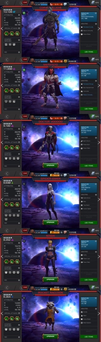 My vtd 5/65 took the work load. Along with 6* ghulk/red hulk. Blade trinity worked a few fights ie magik/Mephistos.