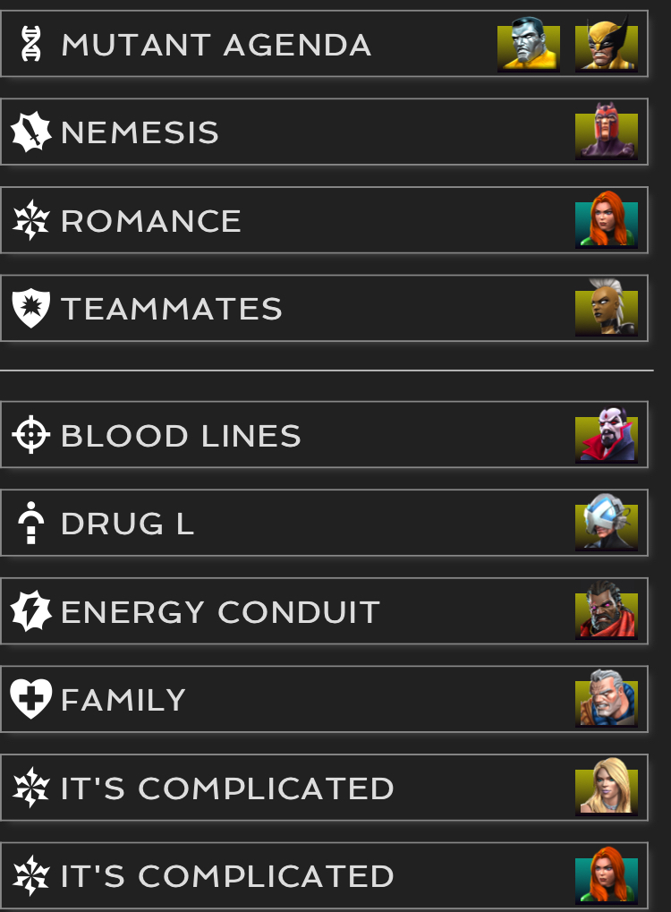 Finally Synergies. Whilst Vulture has a slight edge in utility with a (albeit kind of weak) power control and armour ups (oh and incinerate immunity) Cyclops makes up for this in synergies. The new Professor X synergy is just nuts and cyclops has TONS of these synergies littered around the game, improving himself and others using excellent leadership skills. Here are a couple screenshots of his synergies.