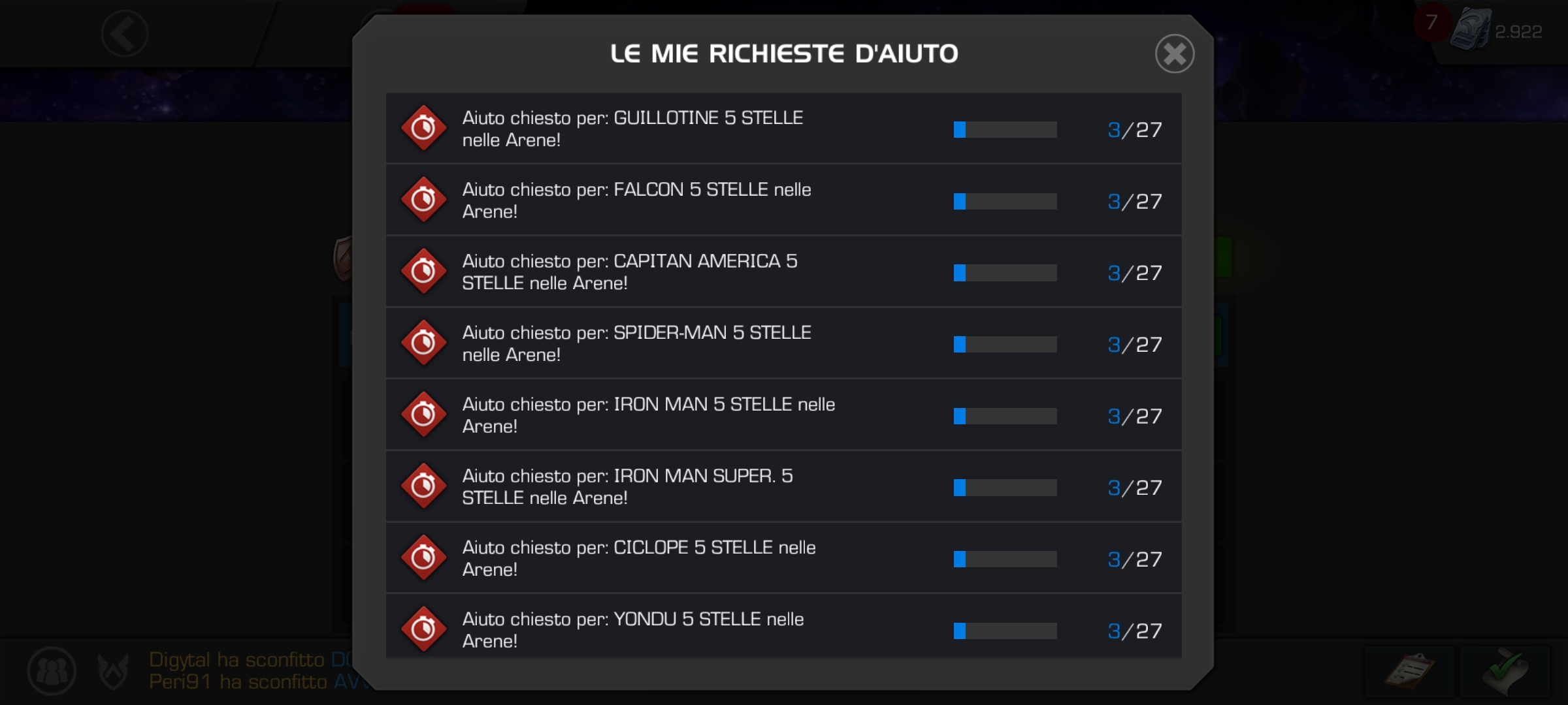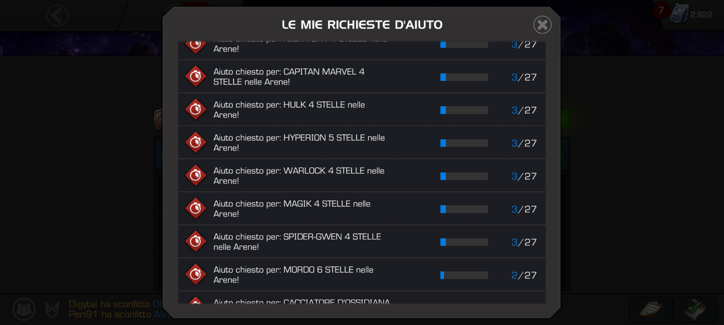 So there are all sorts of issues in the arenas. First of all when I finish my fights only a few times I can actually ask for help, cause it's often so that my champs just disappear. Then when I do ask for help they get stuck there and it's annoying when I have to pick the next 3 champs. Also, recently I noticed that my champs were always coming back from cooldown after many hours. The entire 7 hours for 5 stars and 11 hours for 6 stars (this may be inaccurate, I'm trying to remember the exact numbers). I was kinda pissed at my alliance mates thinking they're never pressing the help button but then I went to check my 111 request for help and found this out: