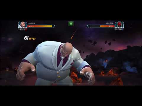 How Kingpin WorksKingpin gains +933.3 Attack (30%) for each debuff on him. At 8 debuffs, he purifies them all to convert to an Overpower Buff which grants him +7777.5 Attack (250%). With his Signature ability, he has up to 90% chance to gain 5 Rage debuffs after his Overpower expires. In the video posted below, at one point I have 4 Overpower Buffs (+1000%) which totals to 31,110 + 4,977 (suicide masteries) = 36k~ attack yet one of my lowest hits deals only 1,970 damage!!