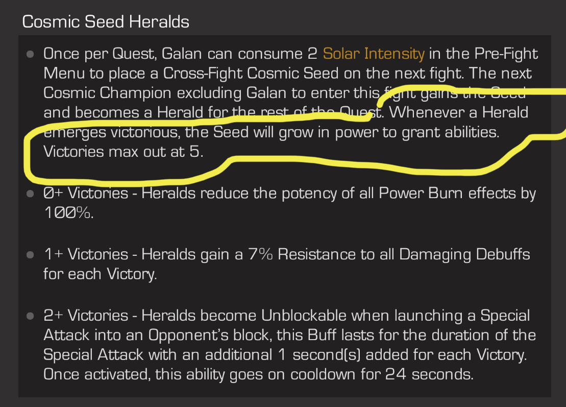 Ever since the deep dive, this has bothered me. Says the seed will grant abilities and victories max at 5, so doesn’t it me like there’s supposed to be new abilities at 3+ Victories and 4+ victories?!?! The only thing that grows is the debuff resistance so I guess technically it’s something, but just seems like something else was planned and maybe taken away pre-launch. (Conspiracy theory lol). Of all the support abilities (white mags pre fight, war machine prefights, mister fantastic prefights, Odin buffs and Apoc horseman), the herald ability seems the most underwhelming.