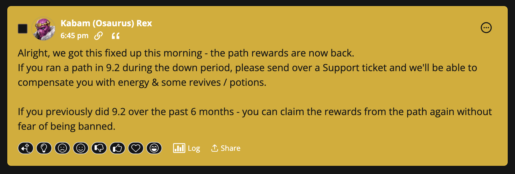 Hello Game Team, I am currently doing act 9.2 and I completed 9.2.1 and 9.2.2 but there were not path rewards showing and given to me after completion, please help me to understand with this situation as I saw In youtube videos the path rewards were there but not now and also I have not received any, please help me.
