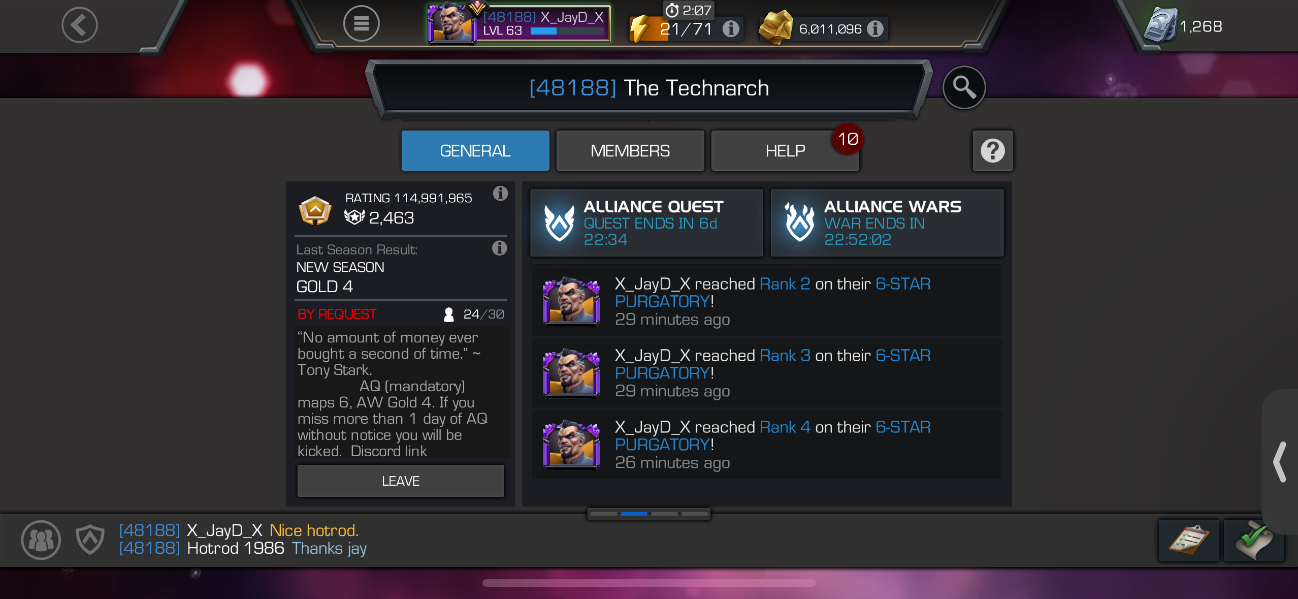 Due to a bug in the game..I am force to close my alliance..if there's a stress free alliance that participates in raids and is looking for 6 players ( 5 valiant and 1 paragon) please let me know here or on line...line id is cataclysm