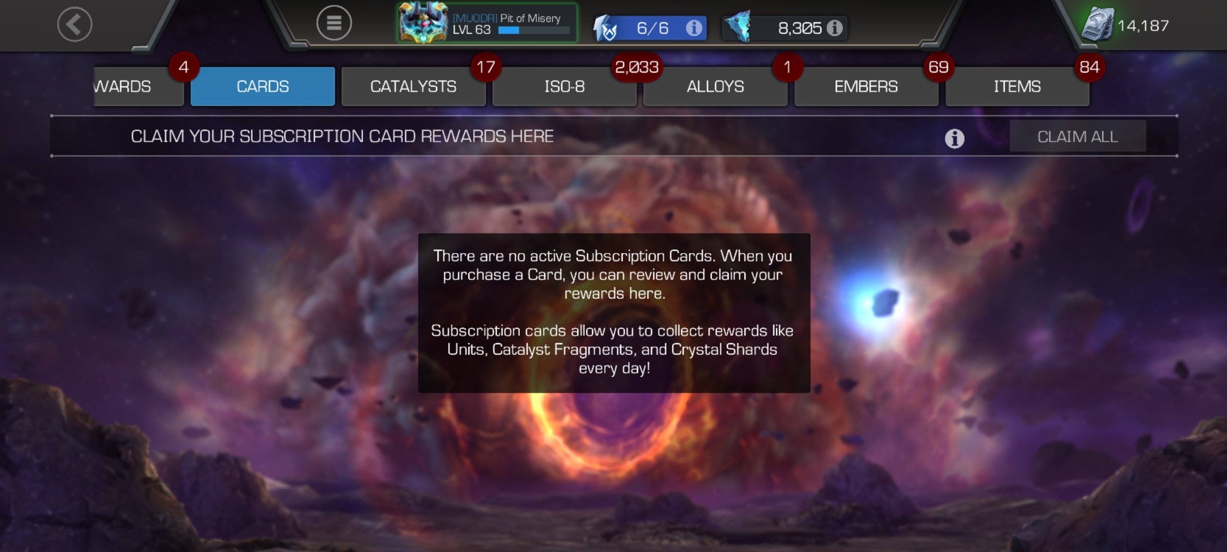 Is there currently a bug with the daily subscription cards? Just logged in and went to collect my 25 (or whatever it is) units when it pops up and it disappeared. Now its showing this and I know i have active subscriptions.