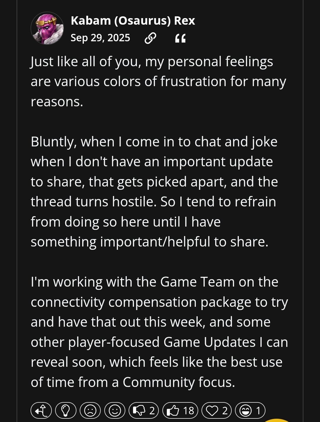 Just making a quick post here since this hasn’t been mentioned in a bit. Along with the AW and AQ compensations, a general one was promised for the performance issues. The game is never going to run perfectly so why hold it off? Feeling like it just won’t come bc it’s been so long.