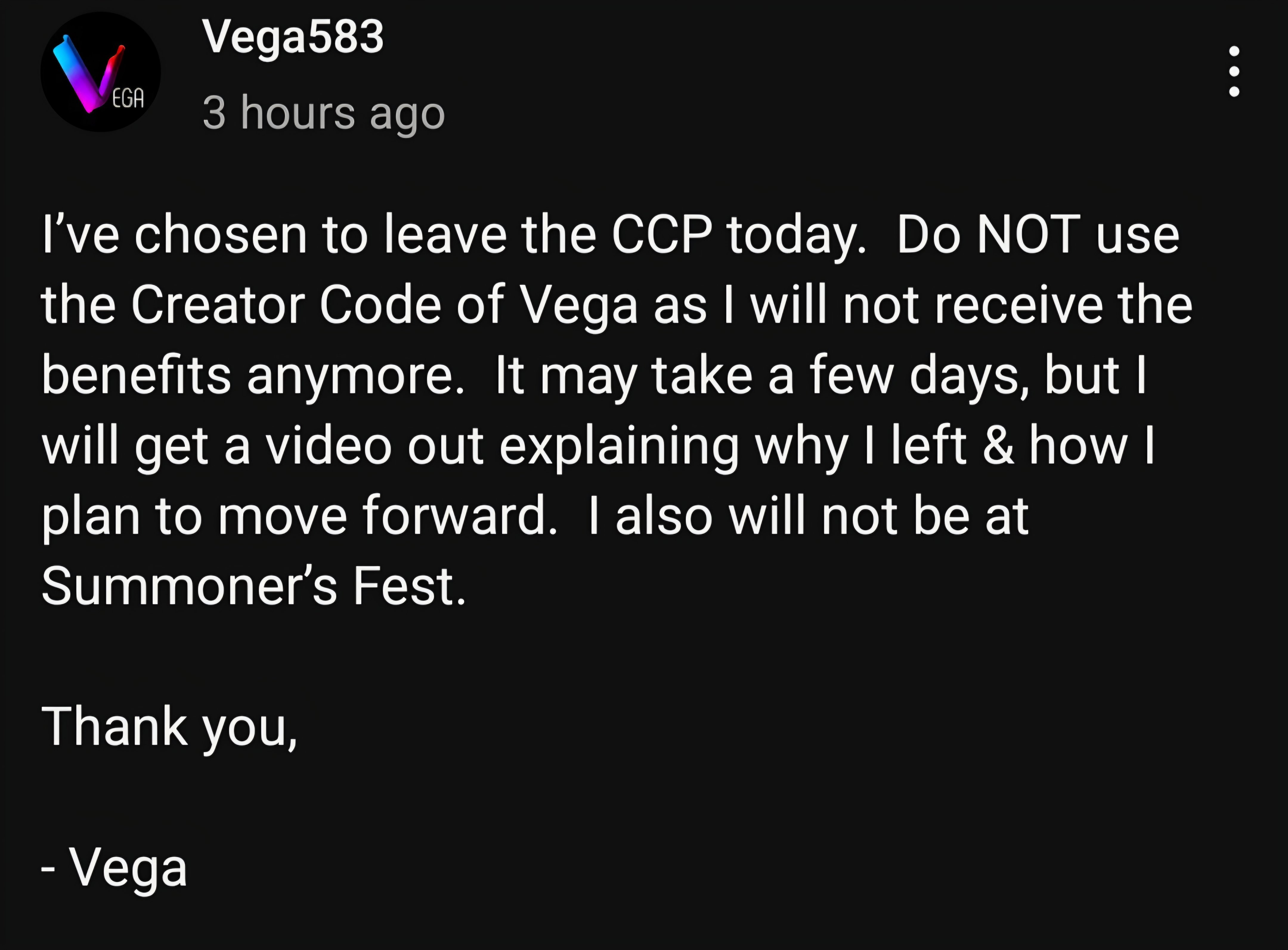 The whole "boycott & we're so back" fiasco, not to mention him leaving the CCP a few times prior has me a bit skeptical of Vega. No shade to him, if he's at a breaking point & speaking out, good for him. I'm just not sold on his commitment. I'm currently re-watching his video & y'all are definitely right. Some of his points do seem personal. As for my opinion on him leaving at his own will or being removed, to me, it seems as a resignation by request. Lastly, while I disagree with DLL's takes, more often than not, there's nothing good comes from speculating on one person's input. Just leads to a witch hunt. See Fintech & Karate Mike's Carina's challenges...