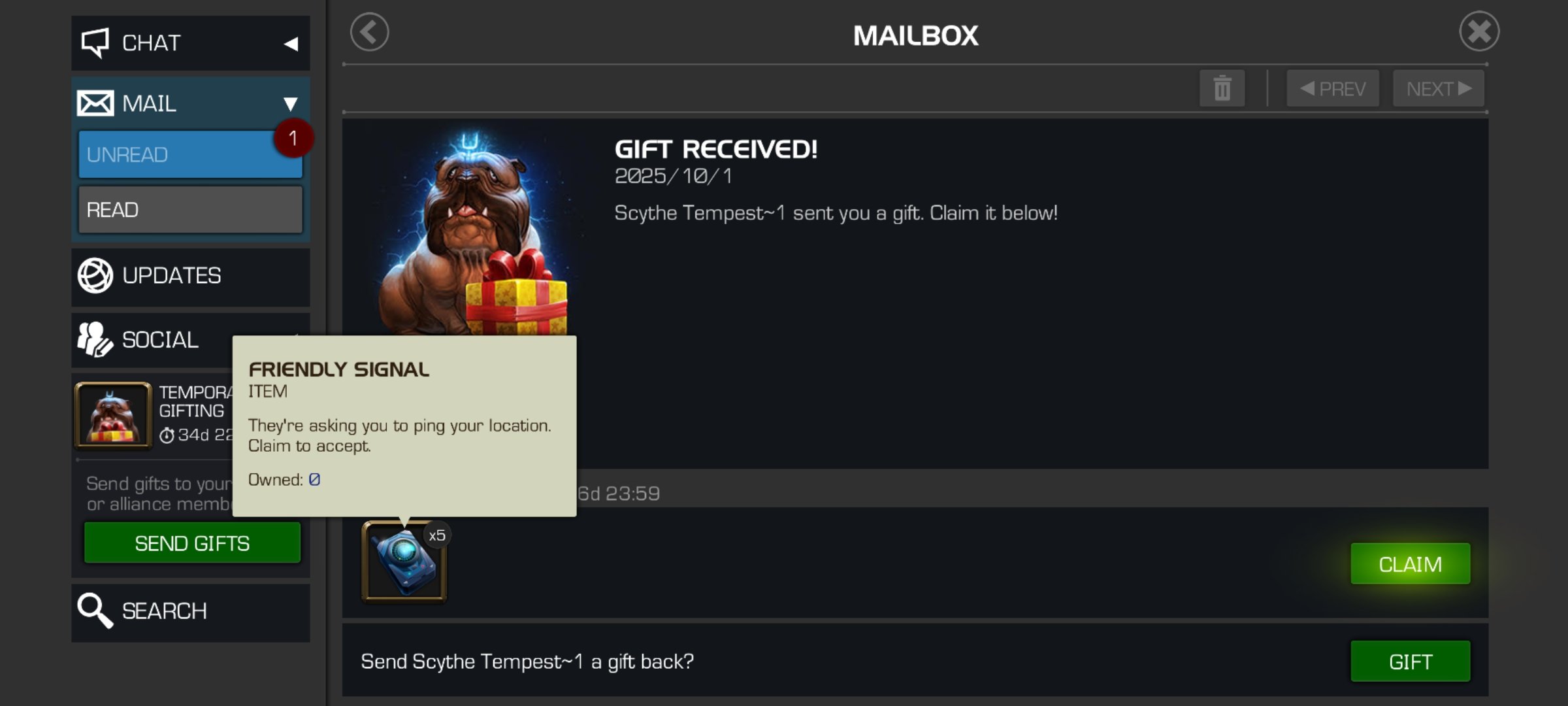 I claim the gift pings but can't see where they are stored. Says "Owned: 0"