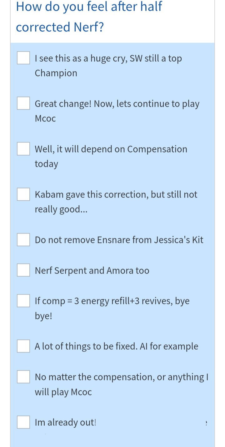 Even being really thankfull to Kabam for this amazing game, I need to put all these choices to be a valid poll.