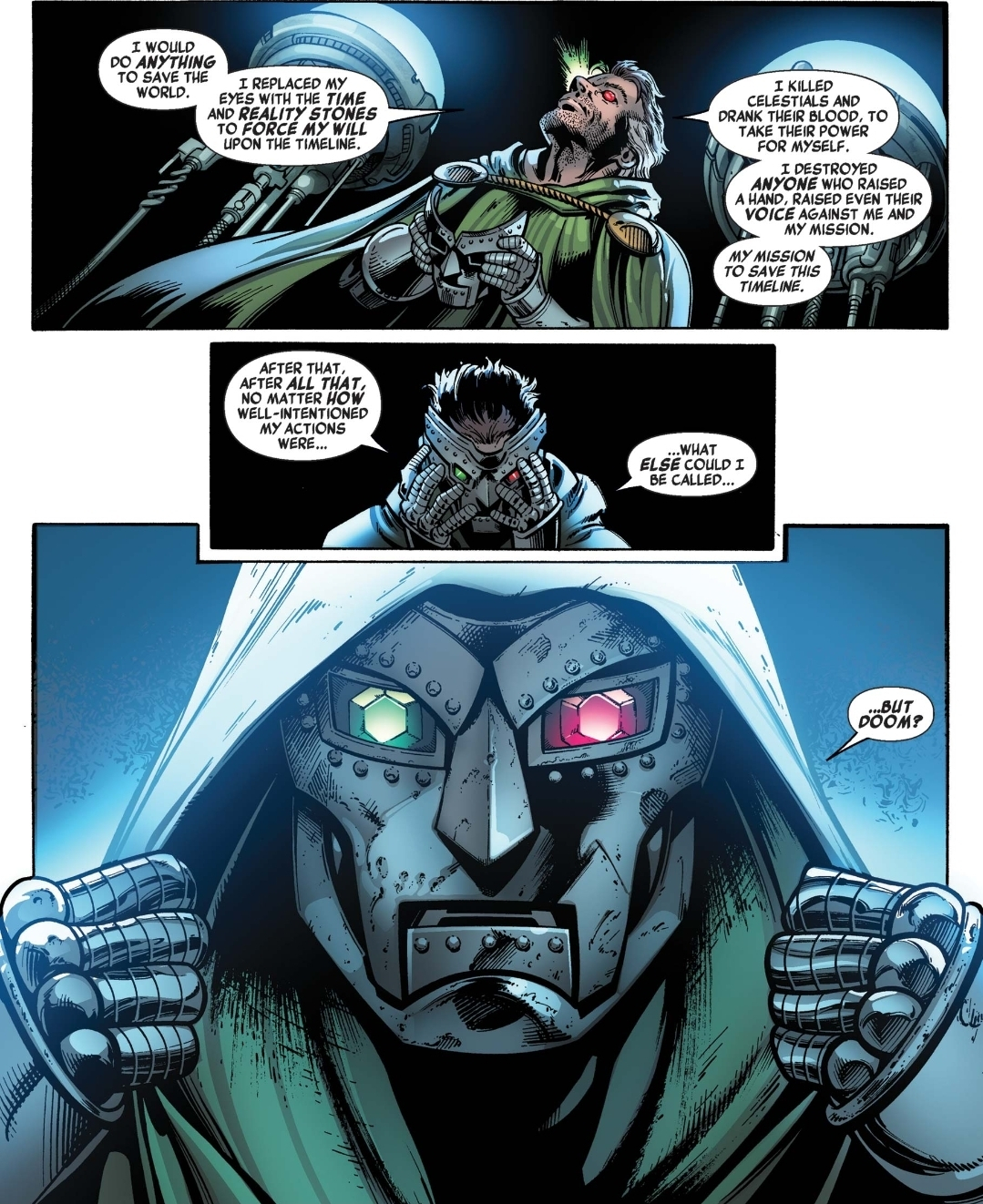 This version of Reed richards is holding together a dying universe all on his own. He killed Celestials and drunk their blood to get stronger, he switched his eyes for the Time and Reality stones, he is DOOM!