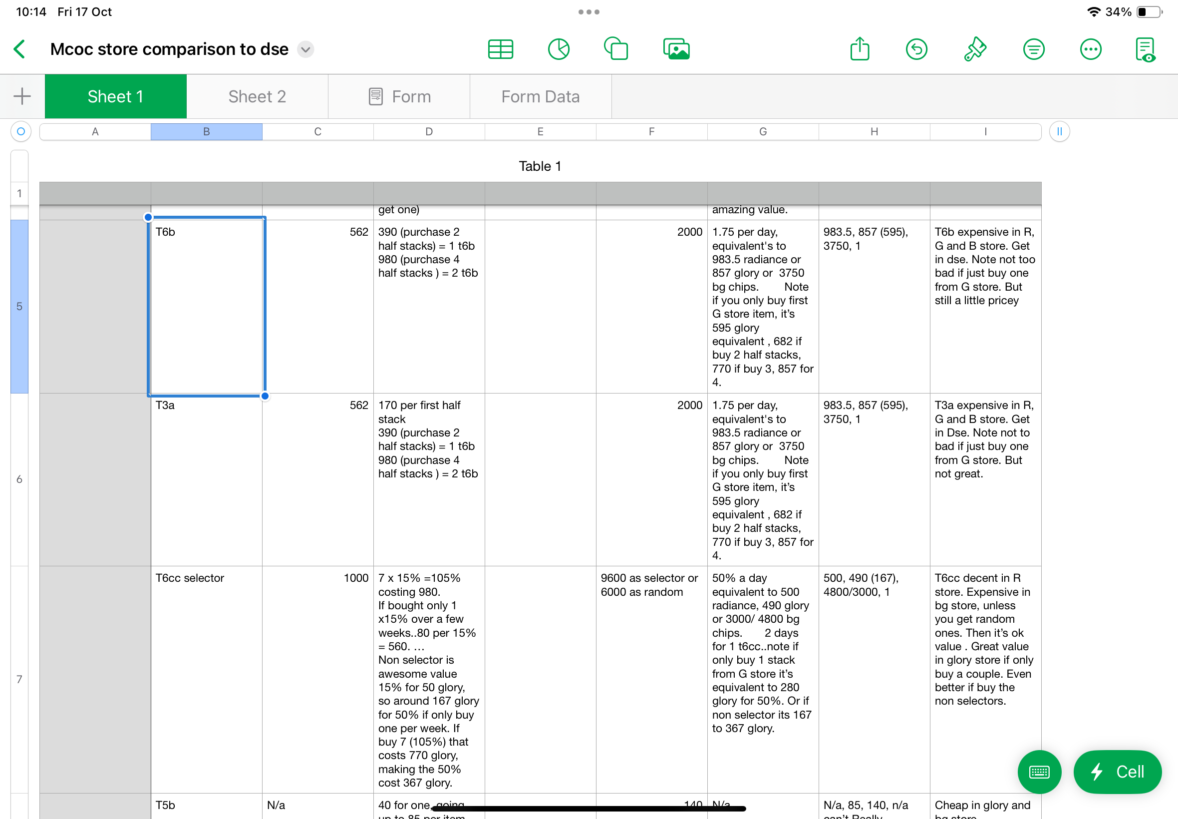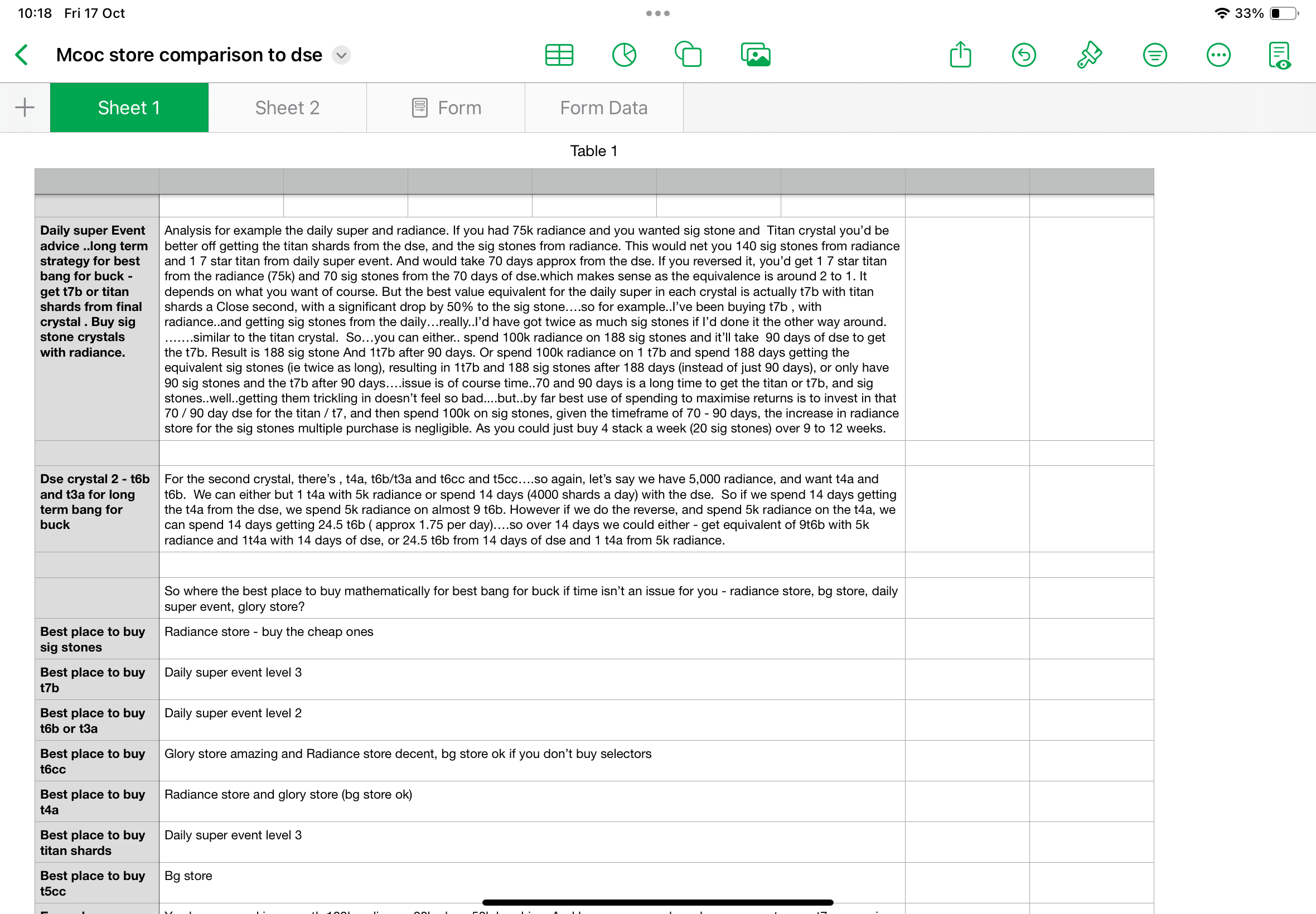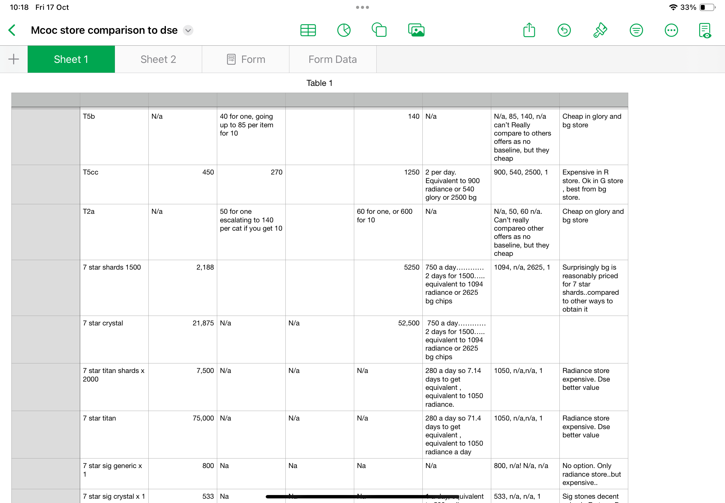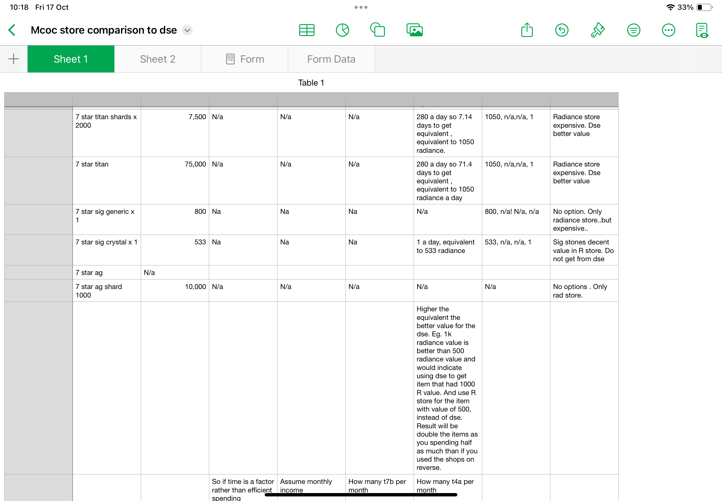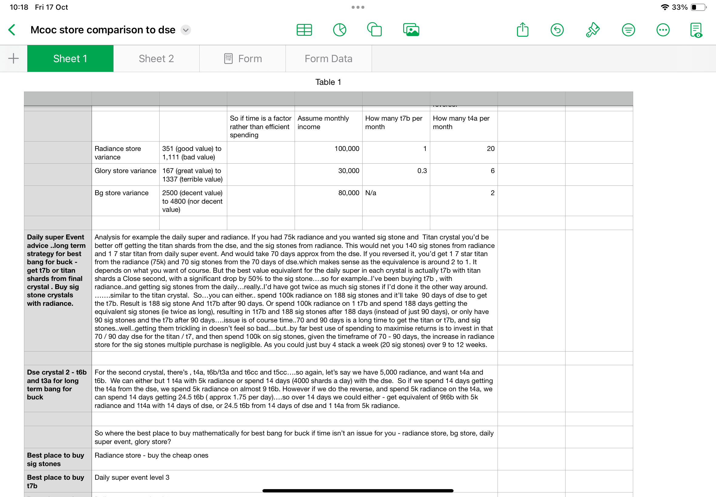 now, in the radiance store, I always wanted the t7b and the titan crystal..then I thought….wait…is it better or worse to do it this way..what would I get if it did the opposite..so t7b/titan from the daily super, and sig stones from the radiance store….so I started comparing…and well…the results are interesting. I’ve put my screenshots below of my spread sheet. It’s not fully done, but done enough to suggest interesting options.