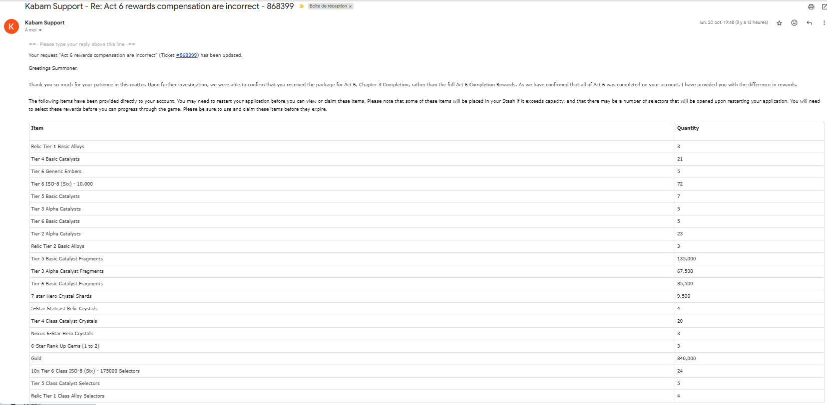 KABAM resolved my ticket after I complained that I had not received the correct compensation for ACT 6. It took five days to get a response after I submitted the necessary supporting informations.