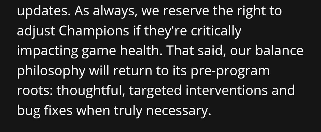 I tend to agree with this. I'm sure this is a hot take but I feel like the overall general power level of a characters is pretty apparent after a couple weeks of internal testing. I know the game is huge and there are always going to be weird interactions where certain ability/nodes interactions can really buff a characters strength beyond intention, but, personally, I think they can easily determine with a large degree of accuracy the general strength of a champion and the necessity of a buff/nerf pre-release.