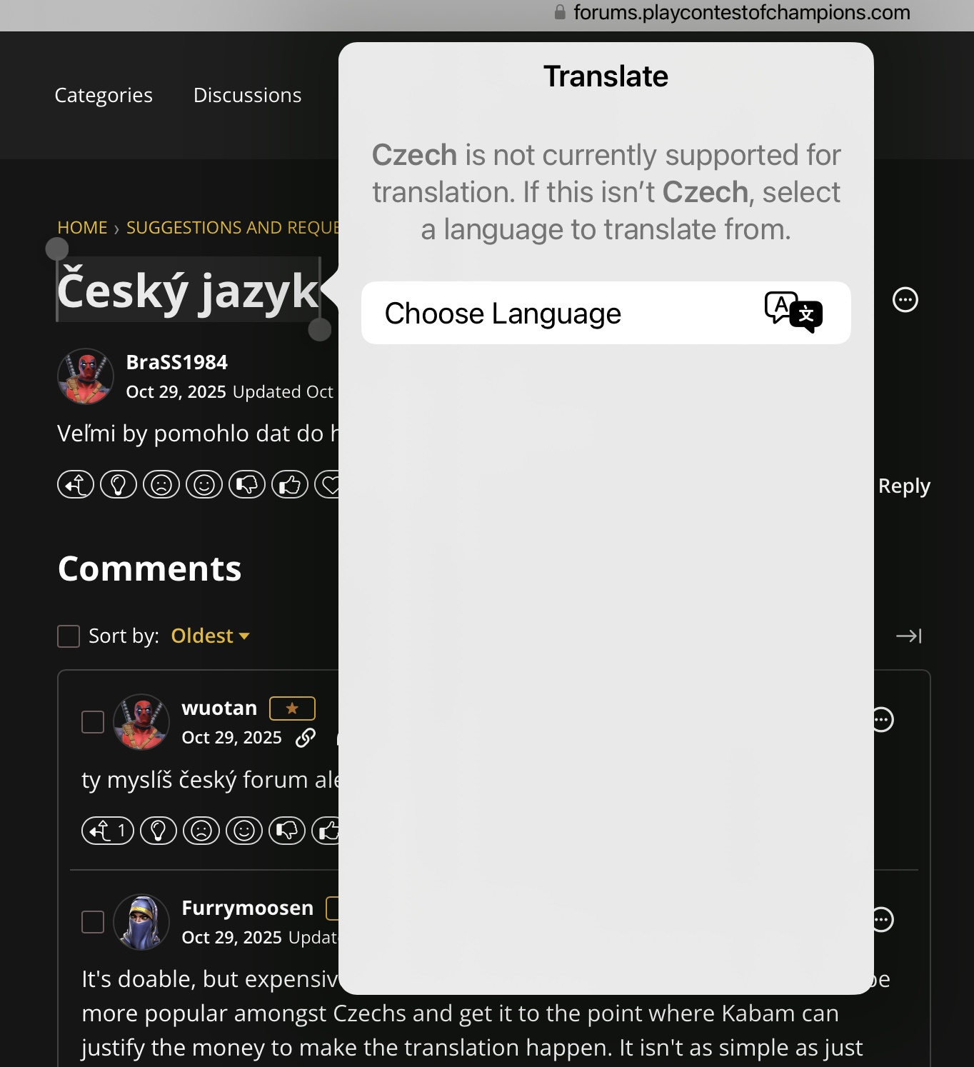 Interesting that my normal method (Apple in-line Translate) for Forums (without having to copy-paste into Google) also does not support Czech.