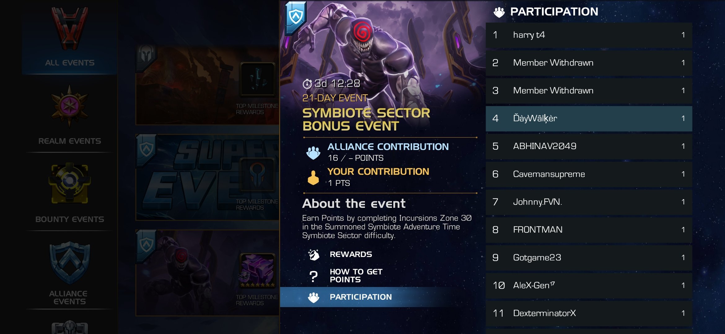 So yesterday I returned to this game, after a small break, joined an alliance and spent almost whole day completing the Symbiote incursions sector up to 30 zones. And when I did, my name appeared in participation list, but didn't get any of the rewards. So was all this hard work just in vain? Or will I get the rewards?