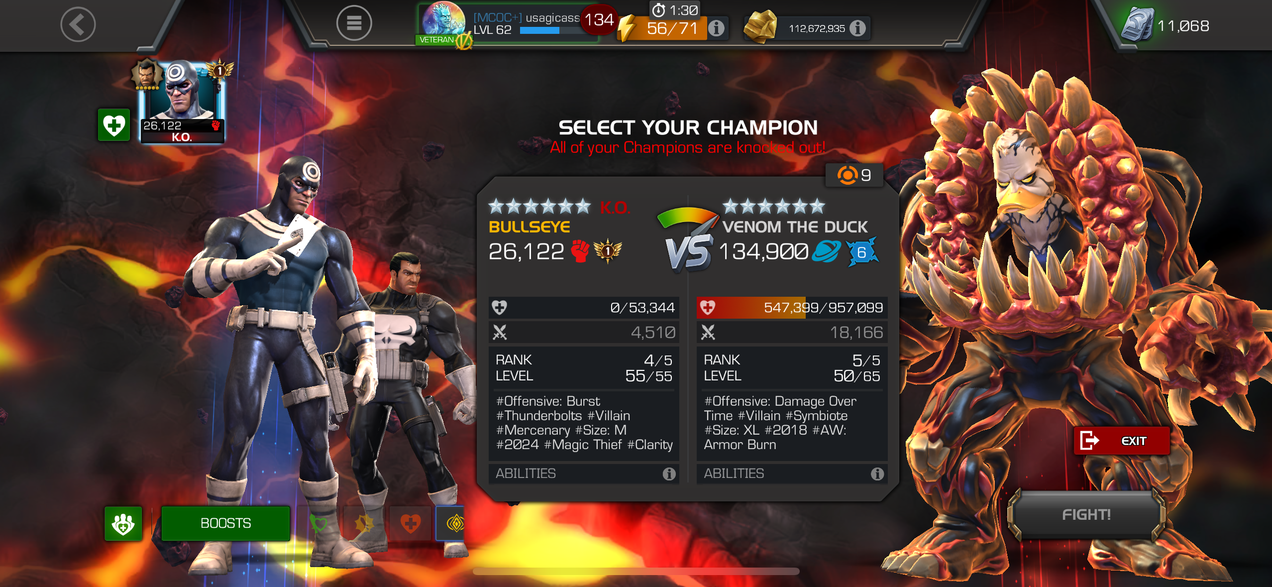 I am frustratingly STUCK at Venom the Duck, of all people. You are supposed to use high crit champs, so I’m using Bullseye, but each time you crit, the defender gets an Unblockable charge.