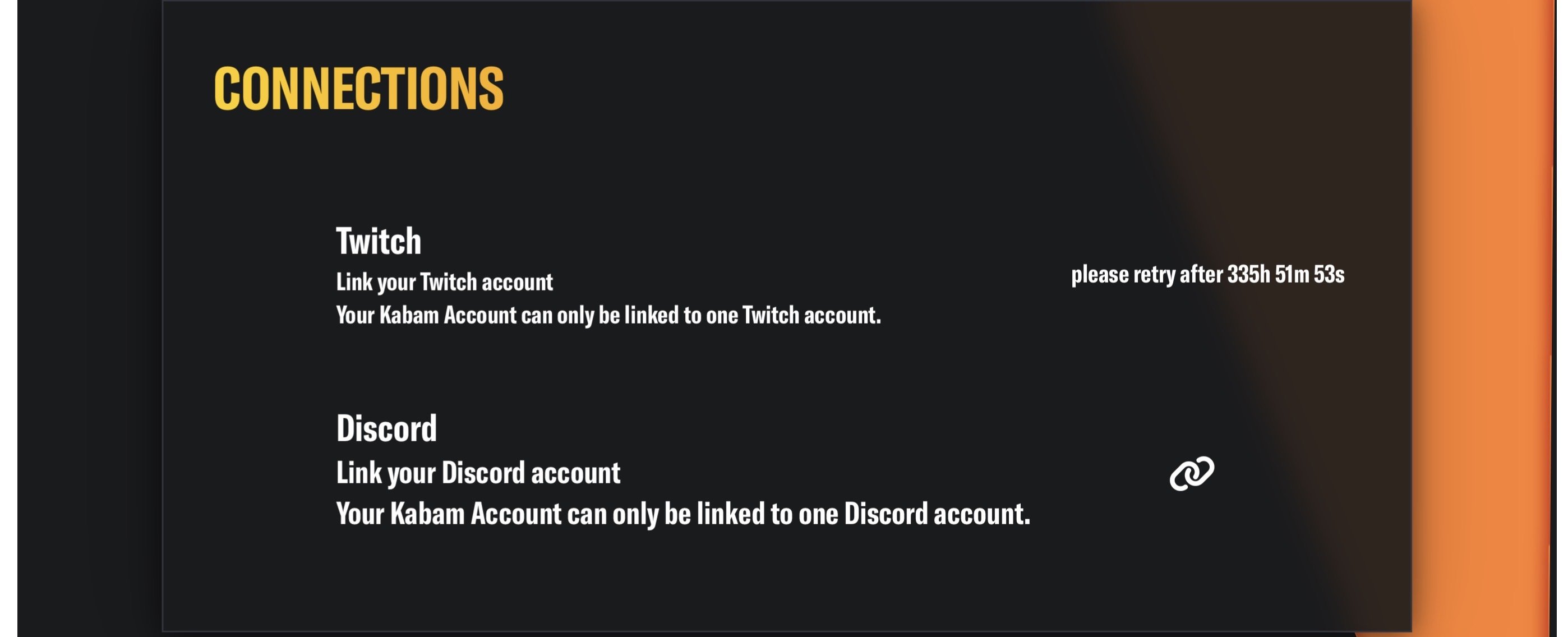 I hope yall can help me out. I had two Twitch accounts — my old one (which was linked to my Kabam account) and a new one. Sadly, I lost access to the old Twitch account, including the email and password. When I tried linking my new one, I got the cooldown timer.