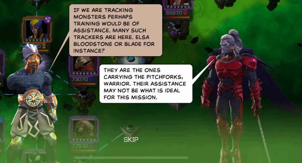 In game it is acknowledged that despite being thought of (and even tagged) as a standard villain, Dracula is much closer to being an anti-hero similar to the likes of Magneto, Blade, Ghost Rider and a lot of the sort of “Knights of Marvel”. Well in the comics Dracula who we may stereotypically think of as a standard Blade or Dr Strange villain has actually been used far more often as of late as a defender of monsters, mentor to vampire slayers, and as an ambassador of monster nations (this was also the purpose of his relationship with Shiklah who he married in order to form an alliance between monster/oppressed demonic communities that were ultimately abandoned. In game it is interesting to point out the description of Dracula’s event quest where it is the Prince who recruits the summoner in an effort to save the monsters of the night from mortal exploiters which I will provide examples for through screenshots.