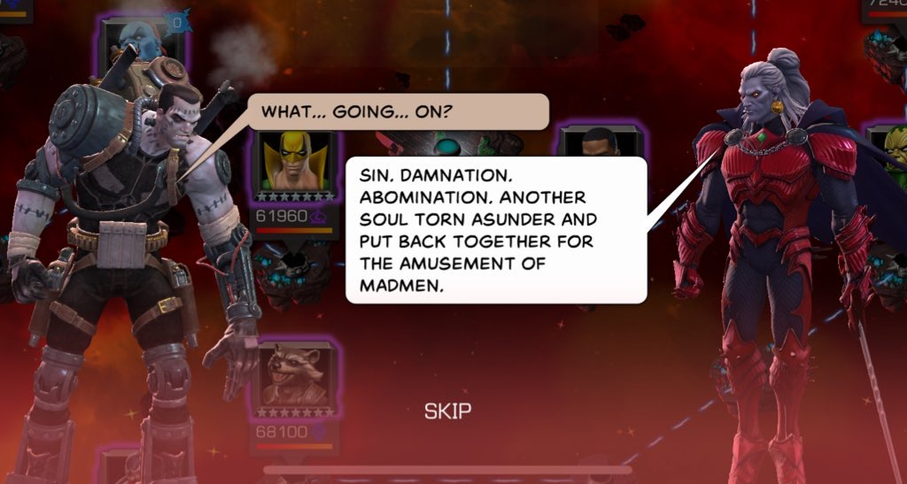 This one will be short and sweet but I think that it was a very bold decision to make the final villain of Dracula’s EQ a clone of Dracula rather than the actual character. This essentially allowed Kabam to keep a standard generic villain version of Dracula for all of us to whale on while the intricacies of the REAL Dracula went unnoticed. It is also worth noting that Dracula actually has a clone in the comics. I believe his name is Bloodspot (something silly like that) and he’s a massive more demonic appearing version of Dracula who on paper should be equal in strength but he has none of Dracula’s drive or resourcefulness.