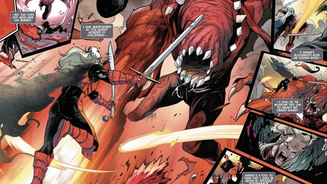 1. Dracula the warlord over the mere magician. Marvel typically likes to bounce back and forth between two sides of Dracula. The suit wearing charismatic necromancer/solomanari that we usually see in films like Nosferatu or the hammer series. And a warrior that we might see in a lot of anime (such as Hellsing) or even the unique take on the character in Blade Trinity. In current comics Dracula basically bounces back and forth between both physical appearances but all of the stereotypical traits are still tightly wrapped within himself. The decision to showcase the more warrior like side to him is a decision that is usually carefully considered and is something meant to specifically bring honor to the character while highlighting the man Vlad the Impaler over the monster that would become Dracula. Let’s take a look at an image of Dracula from his mini series in Blood Hunt where he dawned the same outfit as he wears in game. Notice how he speaks and how he’s presented