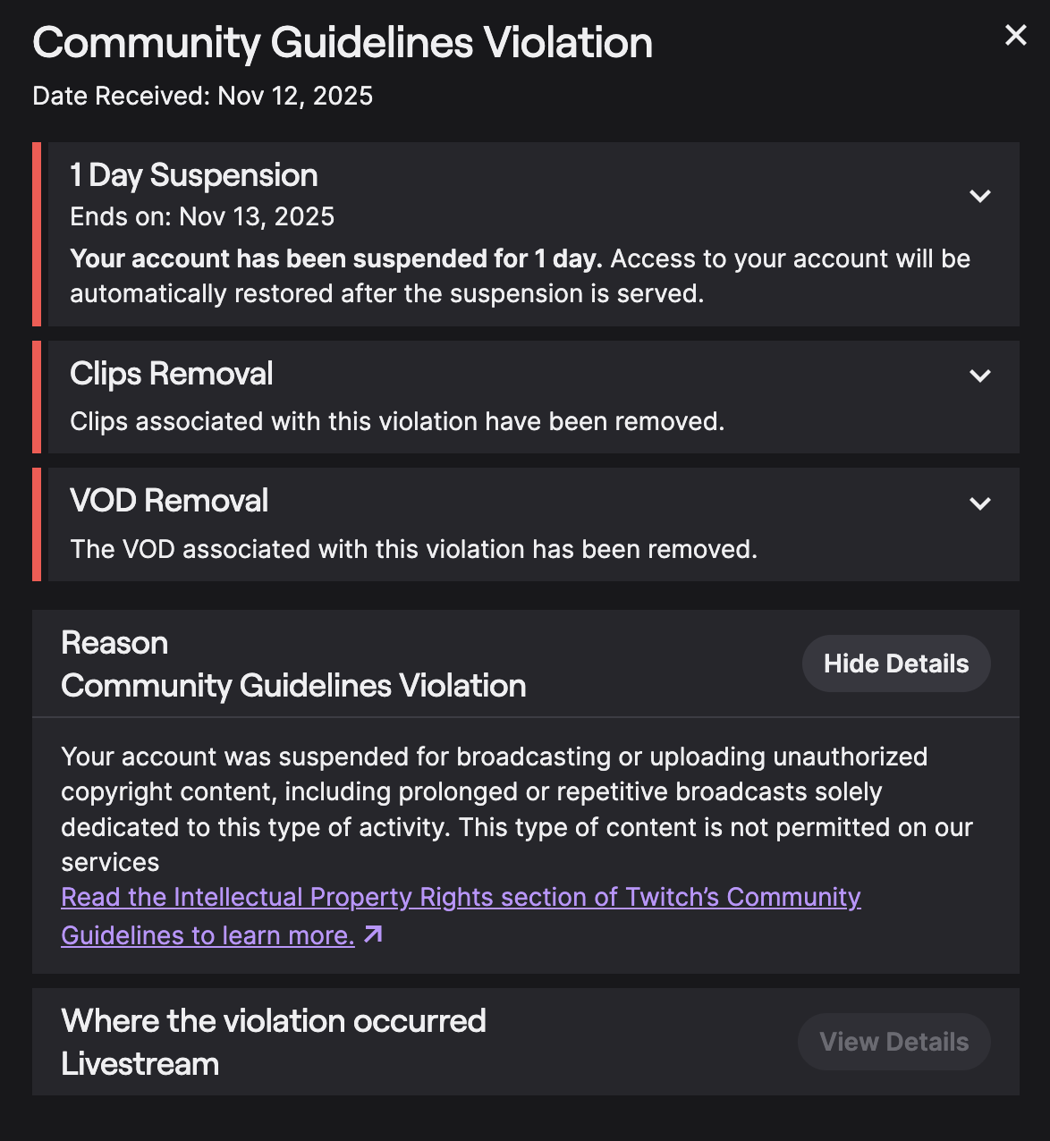 Either way, we cannot rerun the stream with those flags in it without catching another temp ban, but even outside of that, I don't believe we can, seeing the ToS wouldn't allow for it anyway. Not sure how we were able to avoid that for so long, but we're not trying to poke the bear on that one either, especially with a previous flag.