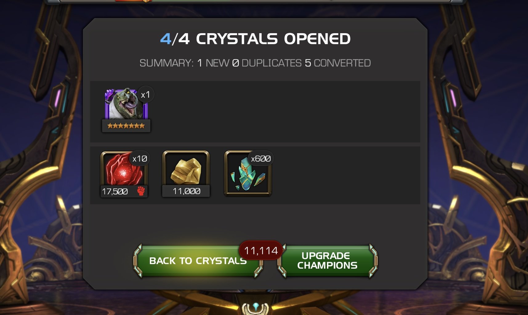Opened 19 seven star basic crystals, all dupes. Summary screen shows I only received 1200 Titan shards total (no, there was not an addition group of shards if I scrolled right).