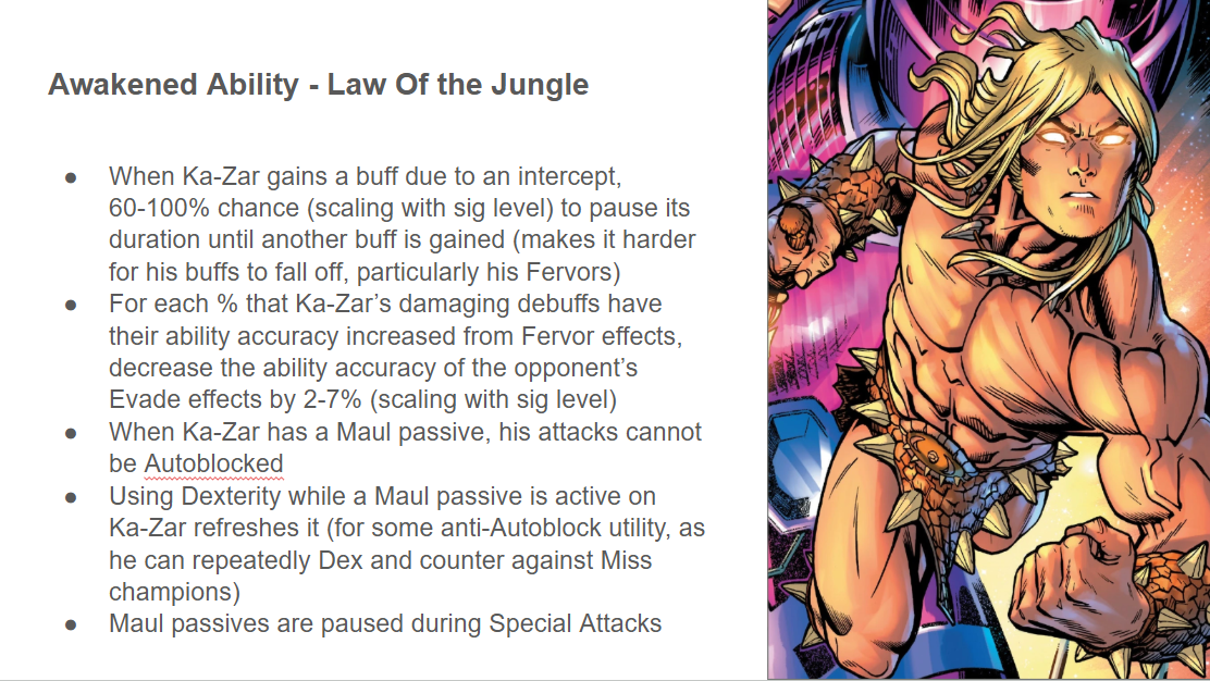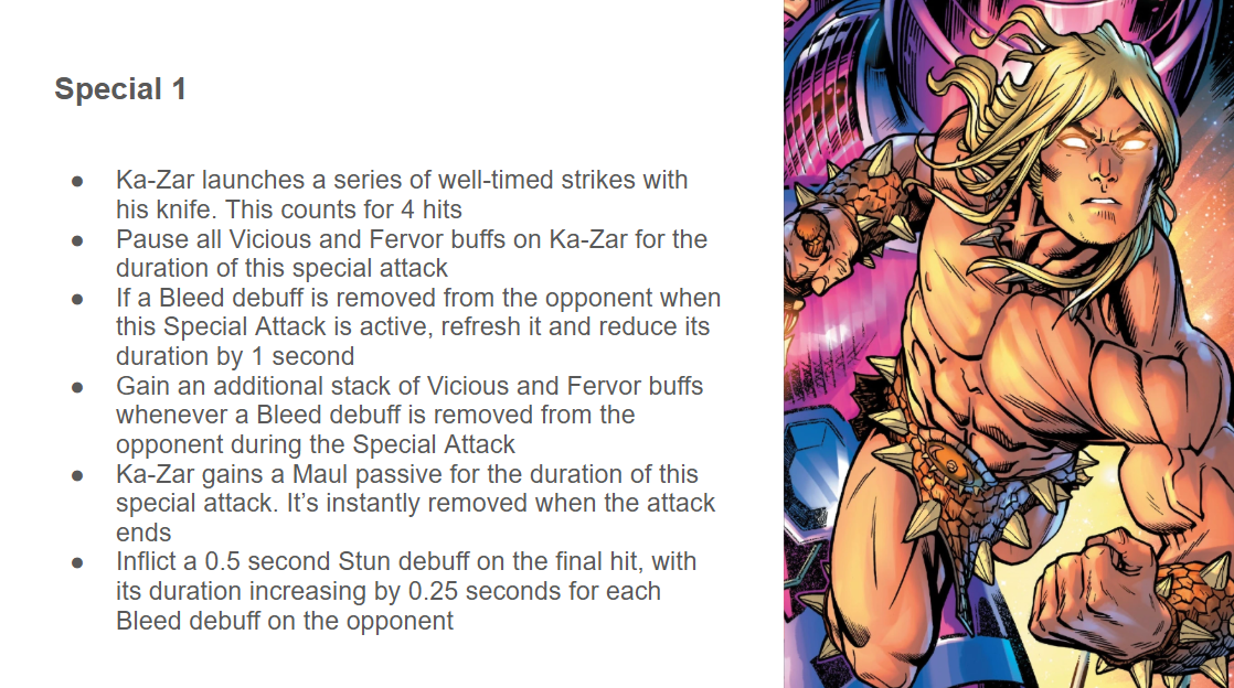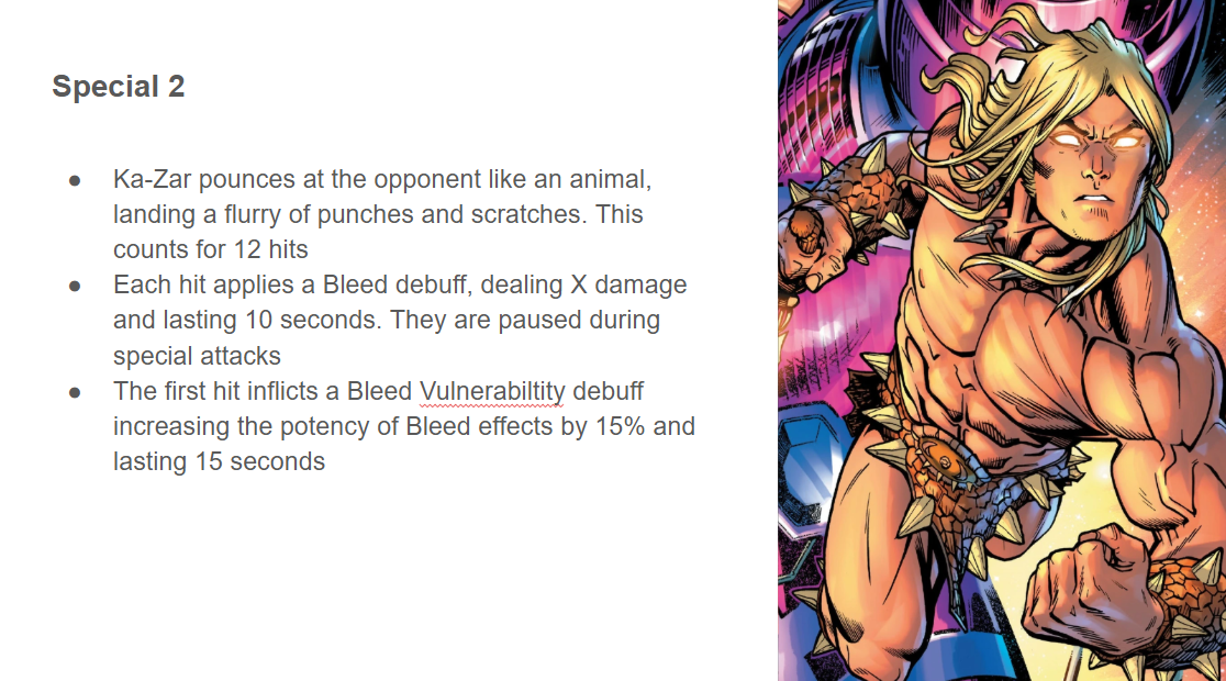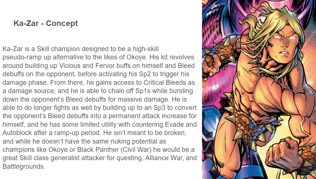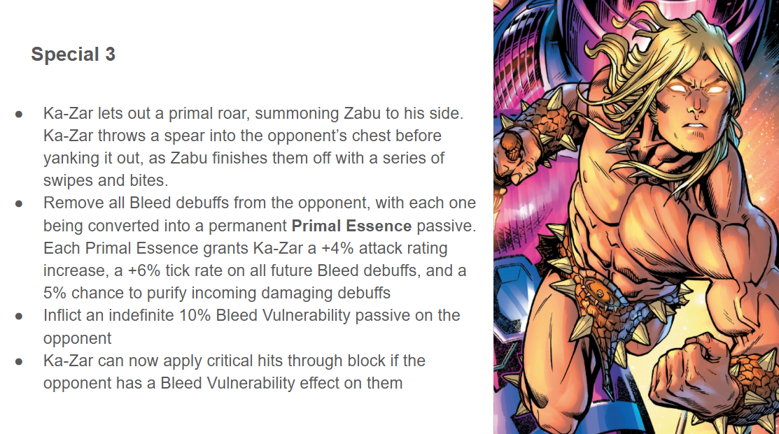 Been working on this champion concept for a while now. Ka-Zar isn't designed to be the pinnacle of the Skill class, but he is an excellent generalist who can work well for most gamemodes. He feels like a mix between Skill debuff champions like Okoye or Nick Fury and Cyclops with his pseudo-special chaining mechanic. Really happy with how this turned out, and as always feel free to make any suggestions.