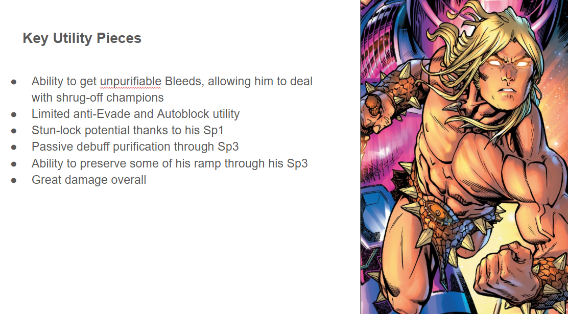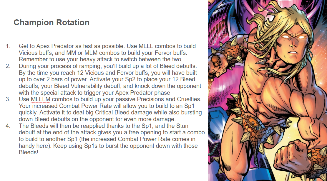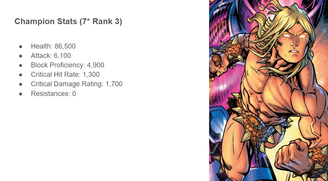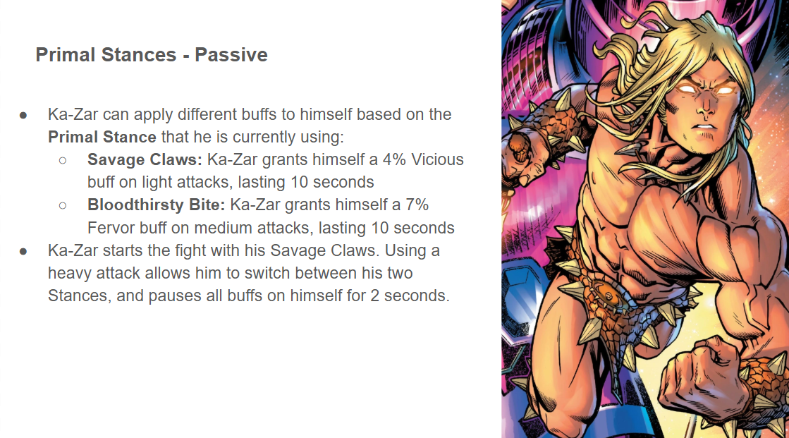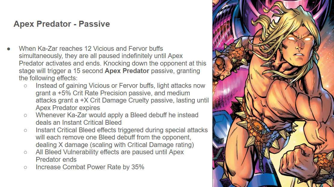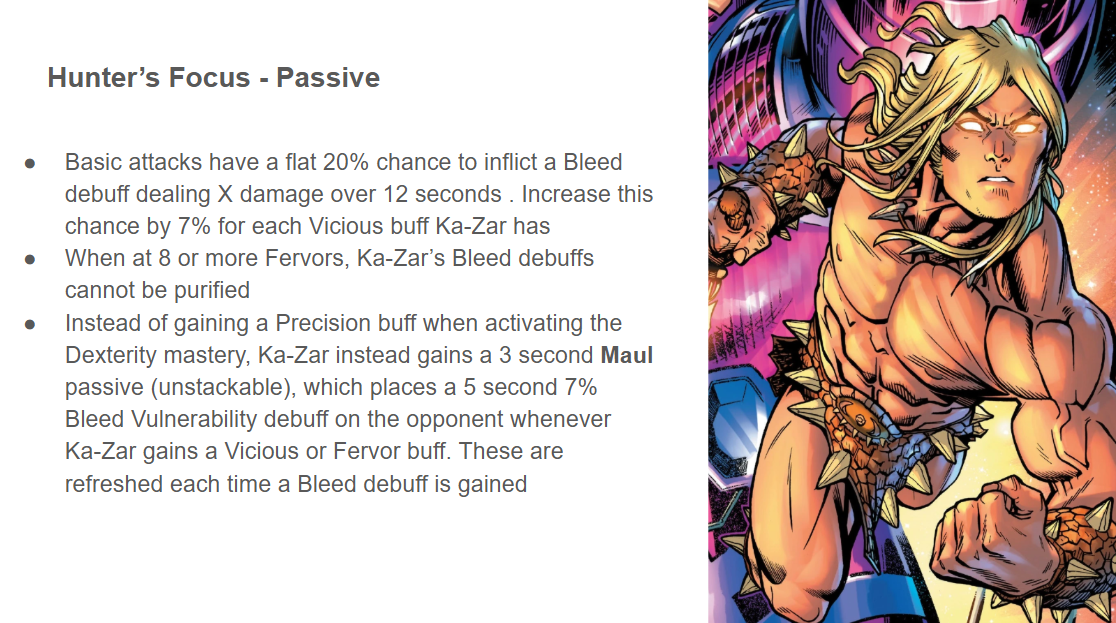 Been working on this champion concept for a while now. Ka-Zar isn't designed to be the pinnacle of the Skill class, but he is an excellent generalist who can work well for most gamemodes. He feels like a mix between Skill debuff champions like Okoye or Nick Fury and Cyclops with his pseudo-special chaining mechanic. Really happy with how this turned out, and as always feel free to make any suggestions.