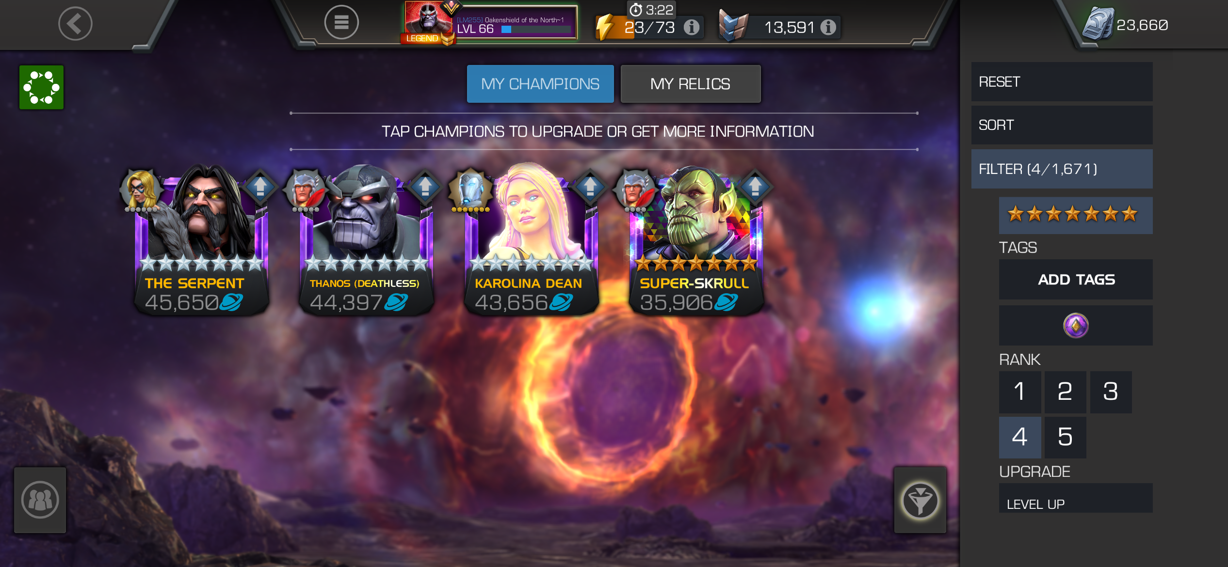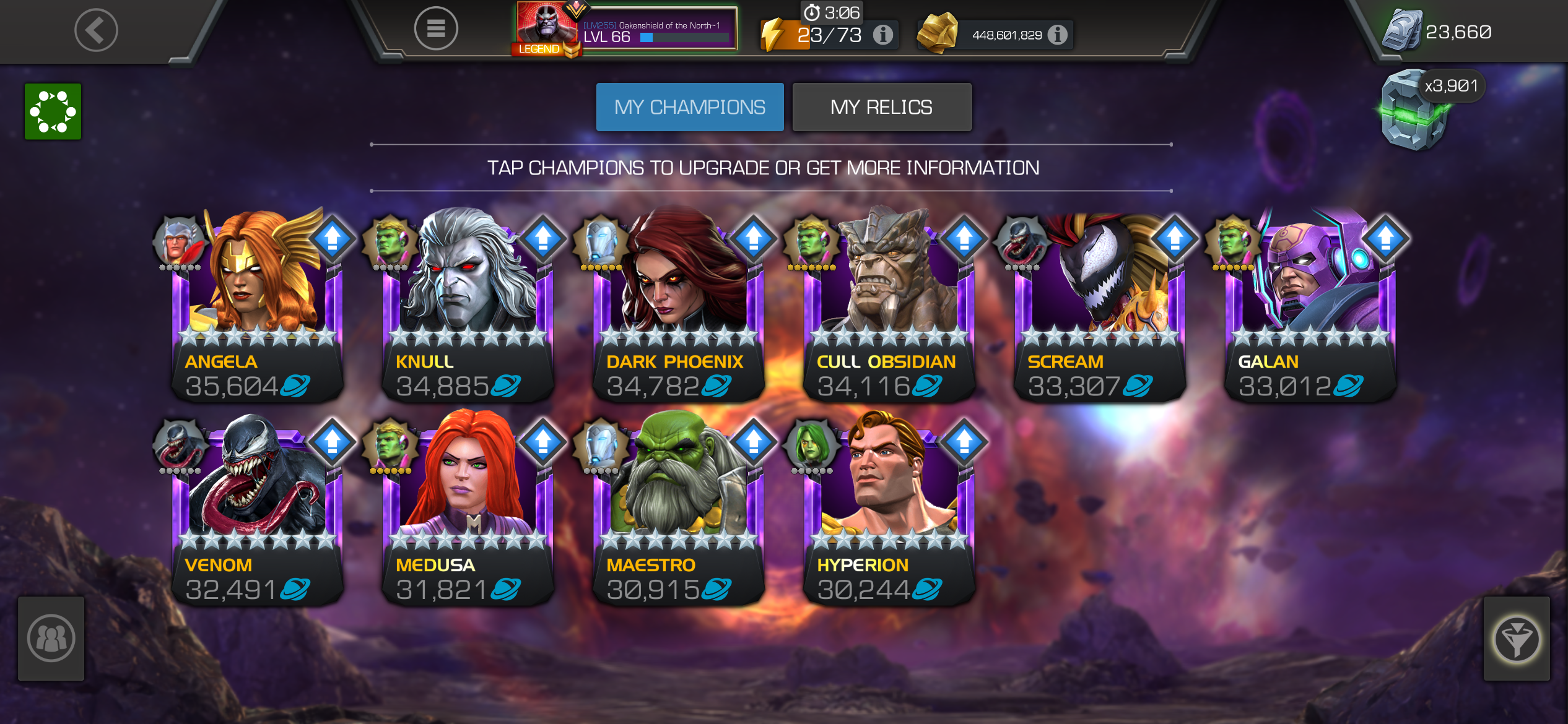 Here are my current R4’s. I feel like I’ve got Dual Threat and Defense well covered. So, leanings towards a Nuke - ie either Venom (since I have the 6* Venom relic awakened, he qualifies) and Cull. I feel like Venom brings a bit more utility and can take a number of annoying matchups including SpiderWoman. Obviously Cull is more the ultimate nuke - particularly if you can armor break - but I’ve only got him at sig 60 so far so wasn’t sure about pulling the trigger before I had him a bit higher.