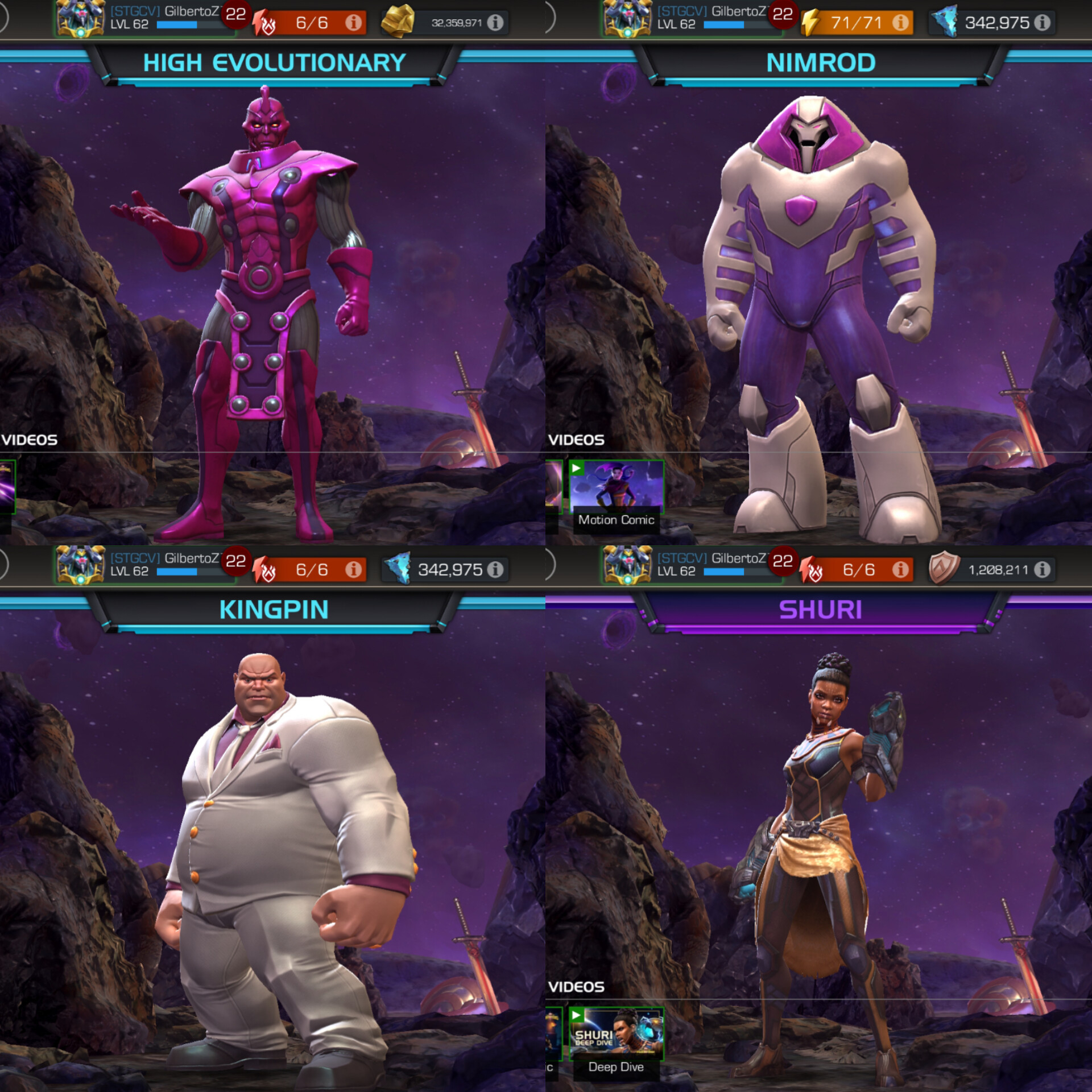 My Vanguards, King Pin fits any bill,High Evolutionary with with any boost would be menace because the boost from Raids alone would make him great, Nimrod and Shuri with those fat stack of armor for a full rampage,damn it would be great