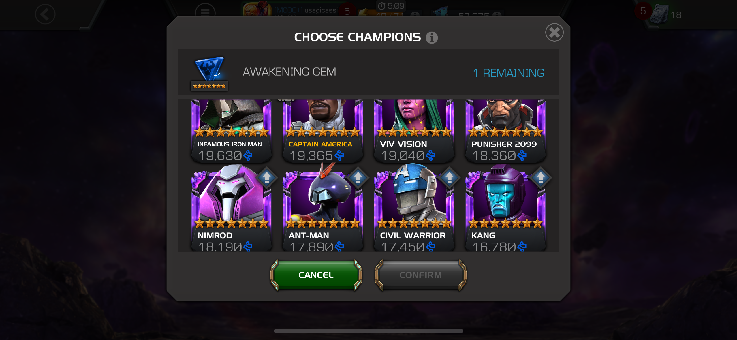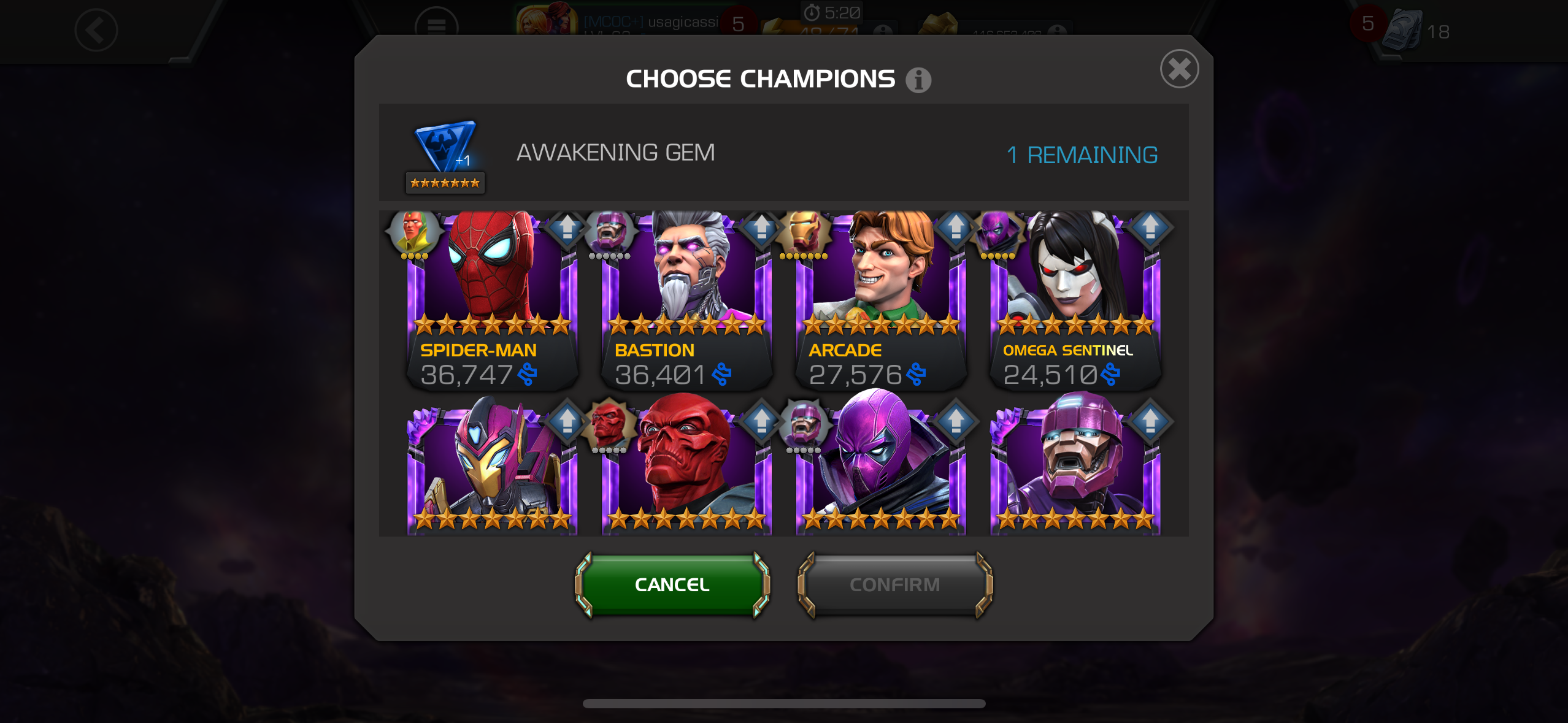 Now I'm just really conflicted what the right move is: use an awakening gem on Starkey and thus grab either Spidey 2099 or Masacre from the selector. They're highly rare champs, but I am just unsure which if either is going to see decent use.