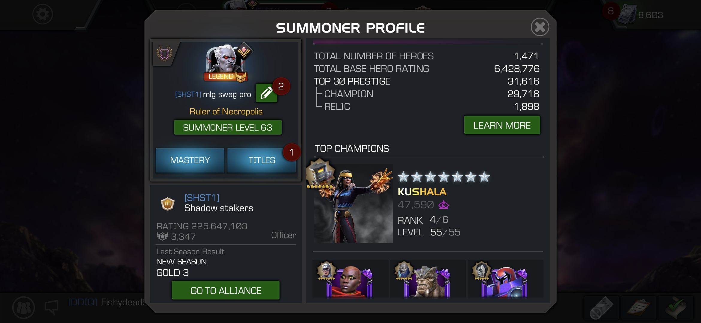 Hello, decent prestiege player here with 28 r4's (hoarding resources for titan rollover) looking for a plat ally running at least map 6 or above aq, nightmare raids and hitting good ranks in coliseum and bgs, just an ally that does everything really