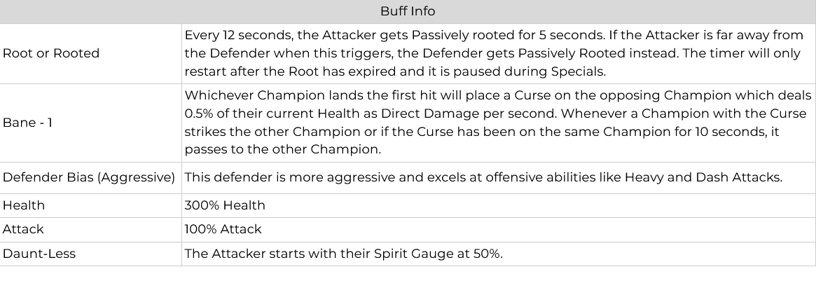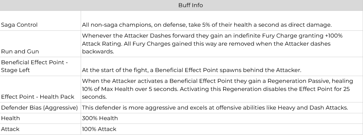 - Saga-tagged Defender Focus (Saga Control Buff): All non-saga champions, on defense, take 5% of their health a second as direct damage.