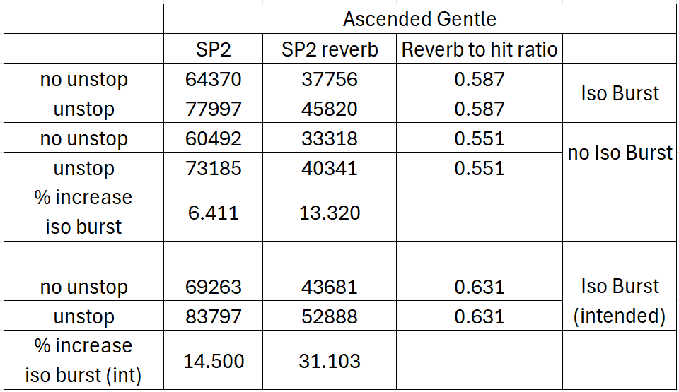 As you can see the percentage increases are all over the place, intended iso burst numbers are provided in the bottom considering a 14.5% increase in iso burst. With how reverb is working right now you would expect 14.5%*14.5%=31.1% increase in reverb dmg. None of this is working as intended.