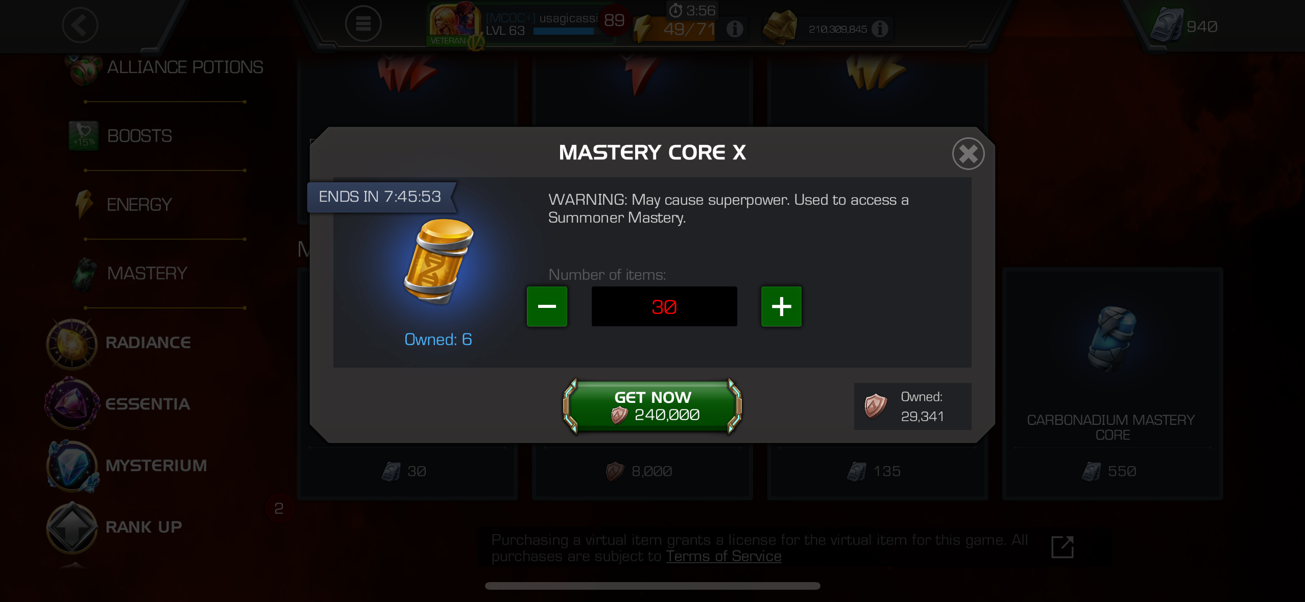 One of the things I wanted to do was go up to 3/5 Mystic Dispersion, which I hadn't been running previously. Before Essentia was a thing, the way to get Mastery Cores was with Loyalty (an easy resource for it) or with Units (and absolute waste of units, when you have an overabundance of Loyalty).